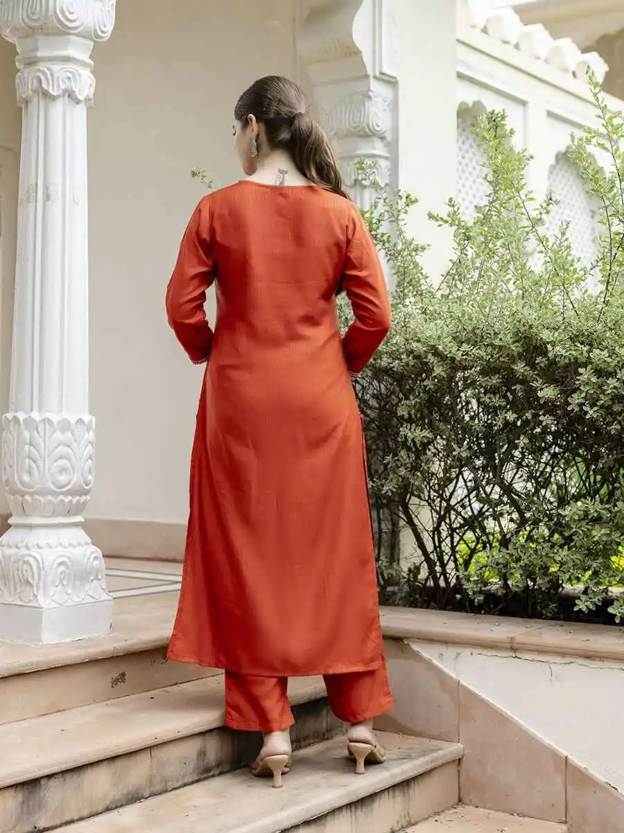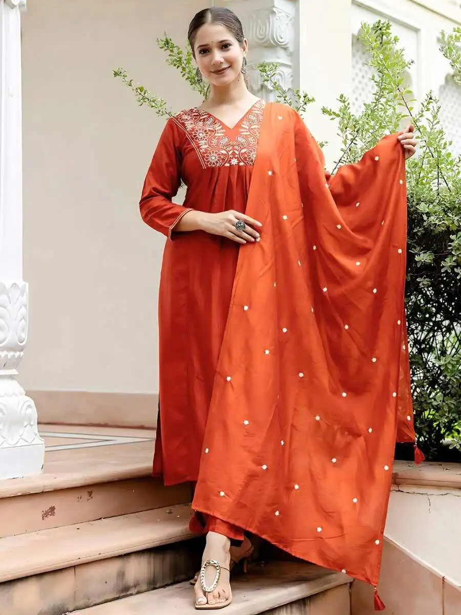 NEW ARRIVAL VISCOSE BLEND SEQUENCE EMBROIDERY WORK TOP BOTTOM WITH DUPATTA ORANGE