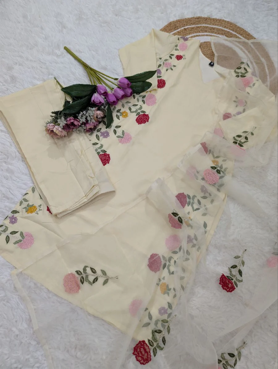NEW ARRIVAL VISCOSE CHANDERI EMBROIDERY WORK TOP BOTTOM WITH DUPATTA CREAM