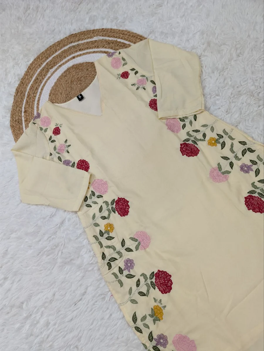 KURTI FABRIC :- 14KG REYON WITH EMBROIDERY DESIGN WORK FULL STITCH NAYRA PATTERN KURTI