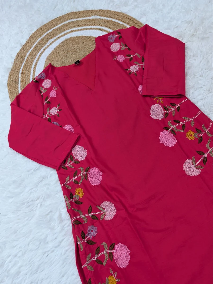 KURTI FABRIC :- 14KG REYON WITH EMBROIDERY DESIGN WORK FULL STITCH NAYRA PATTERN KURTI