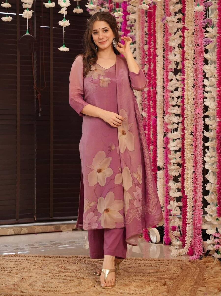 NEW ARRIVAL ZARNA SILK PRINTED WORK TOP BOTTOM WITH DUPATTA WINE