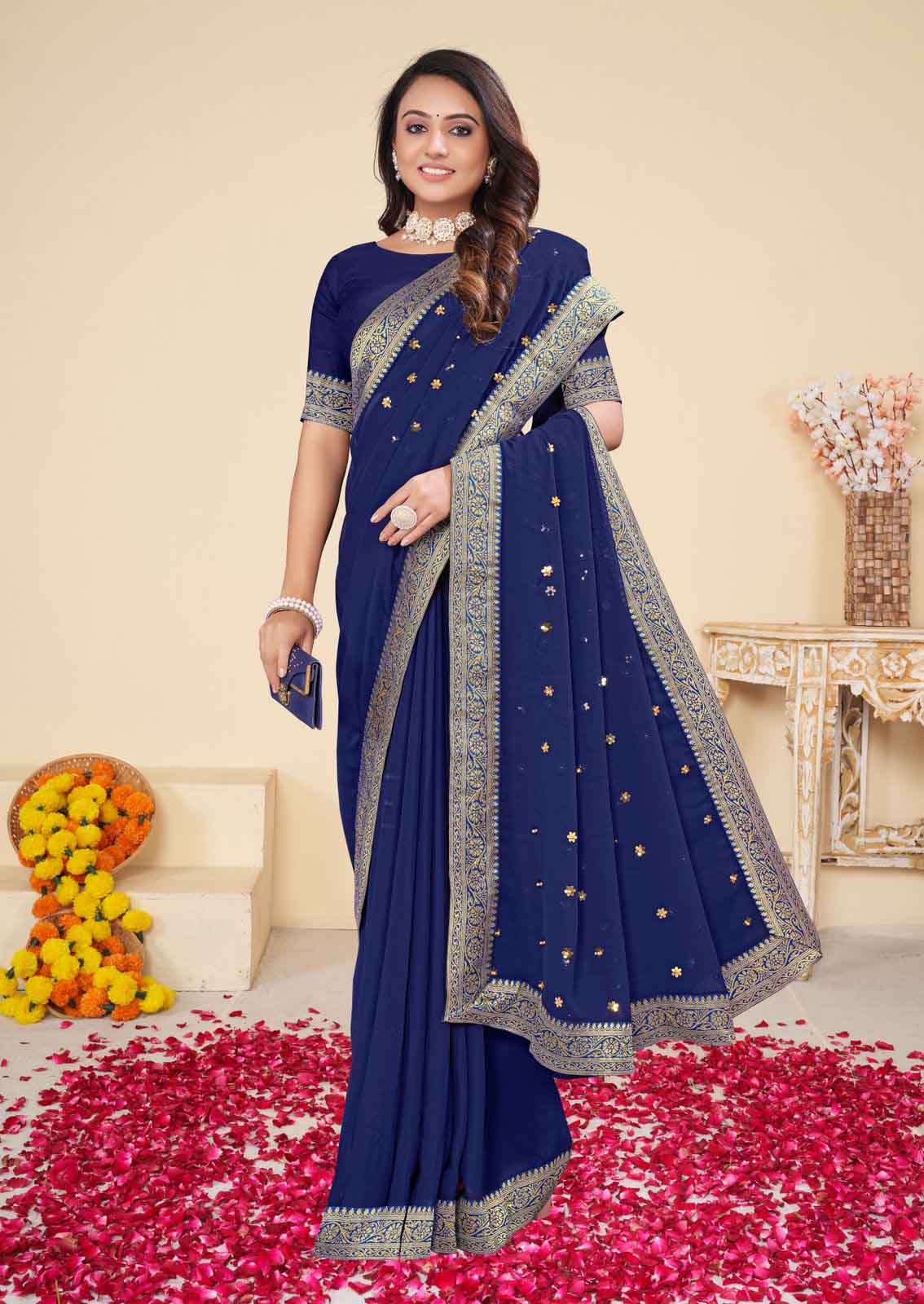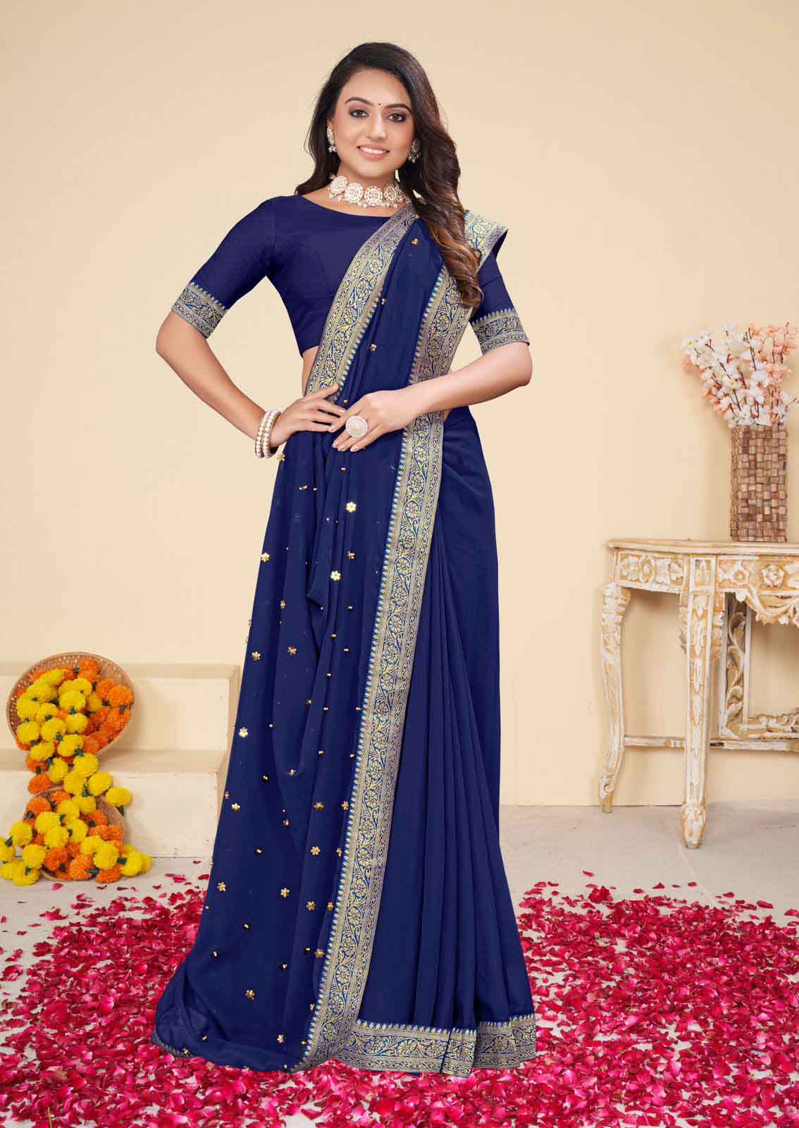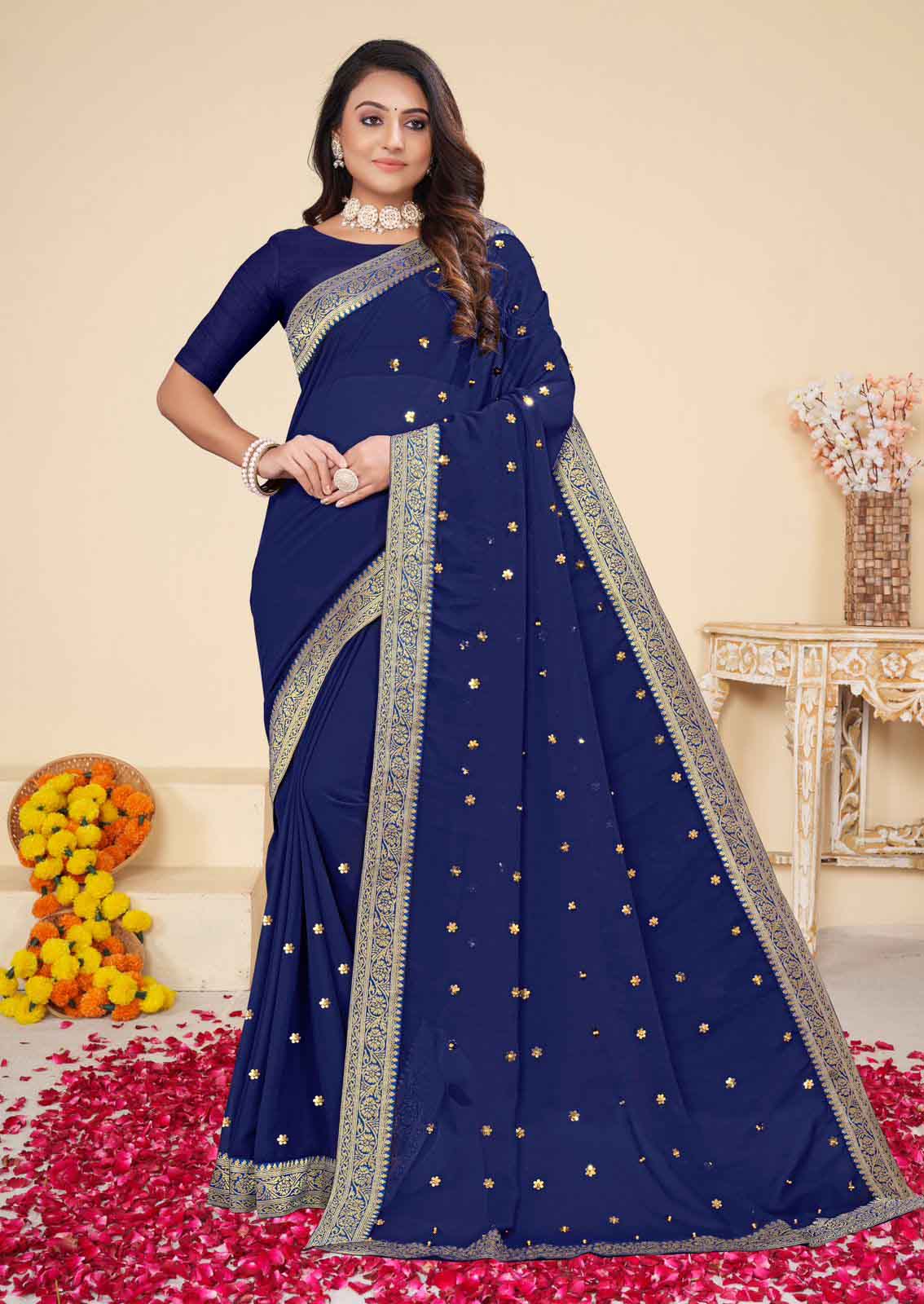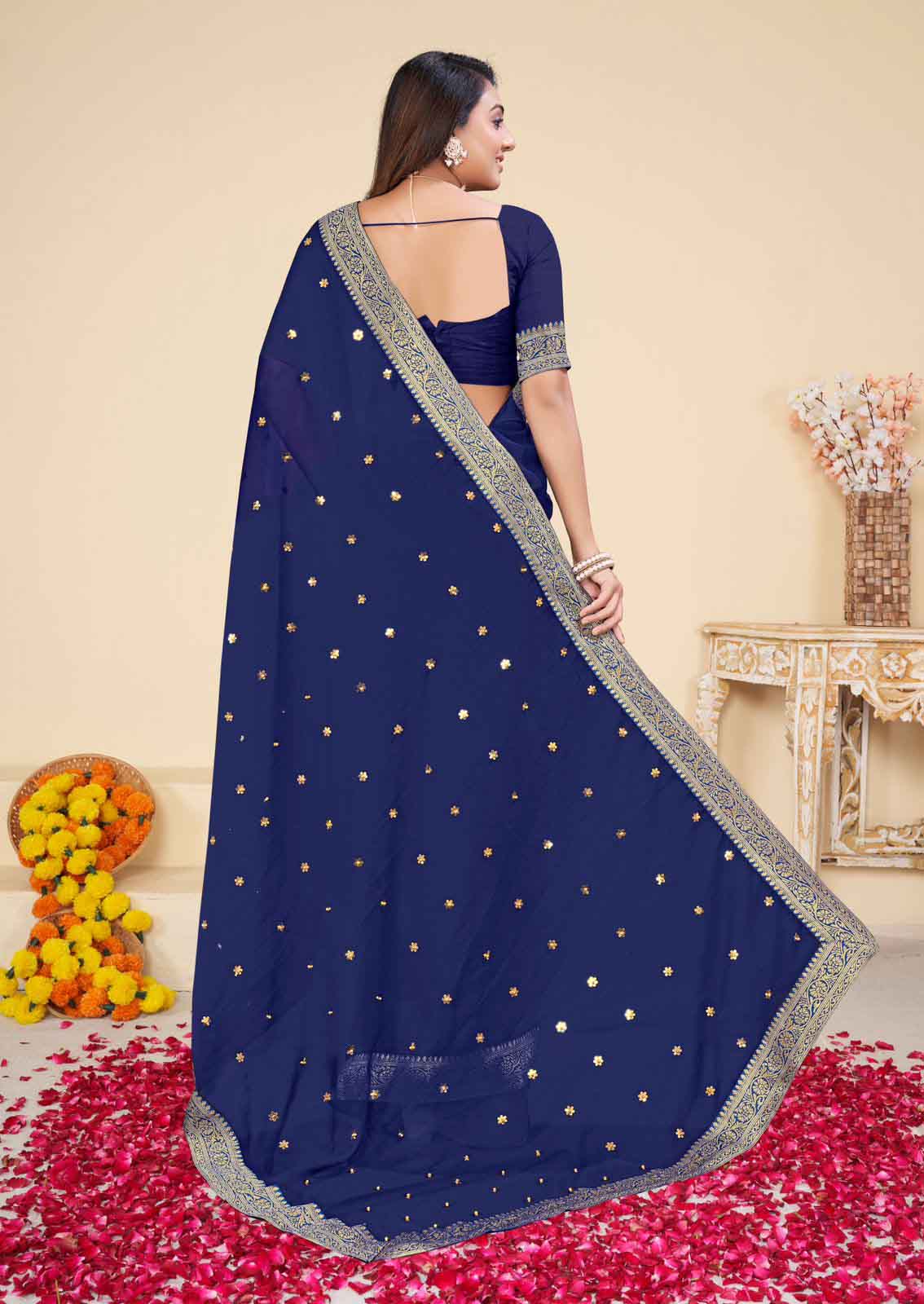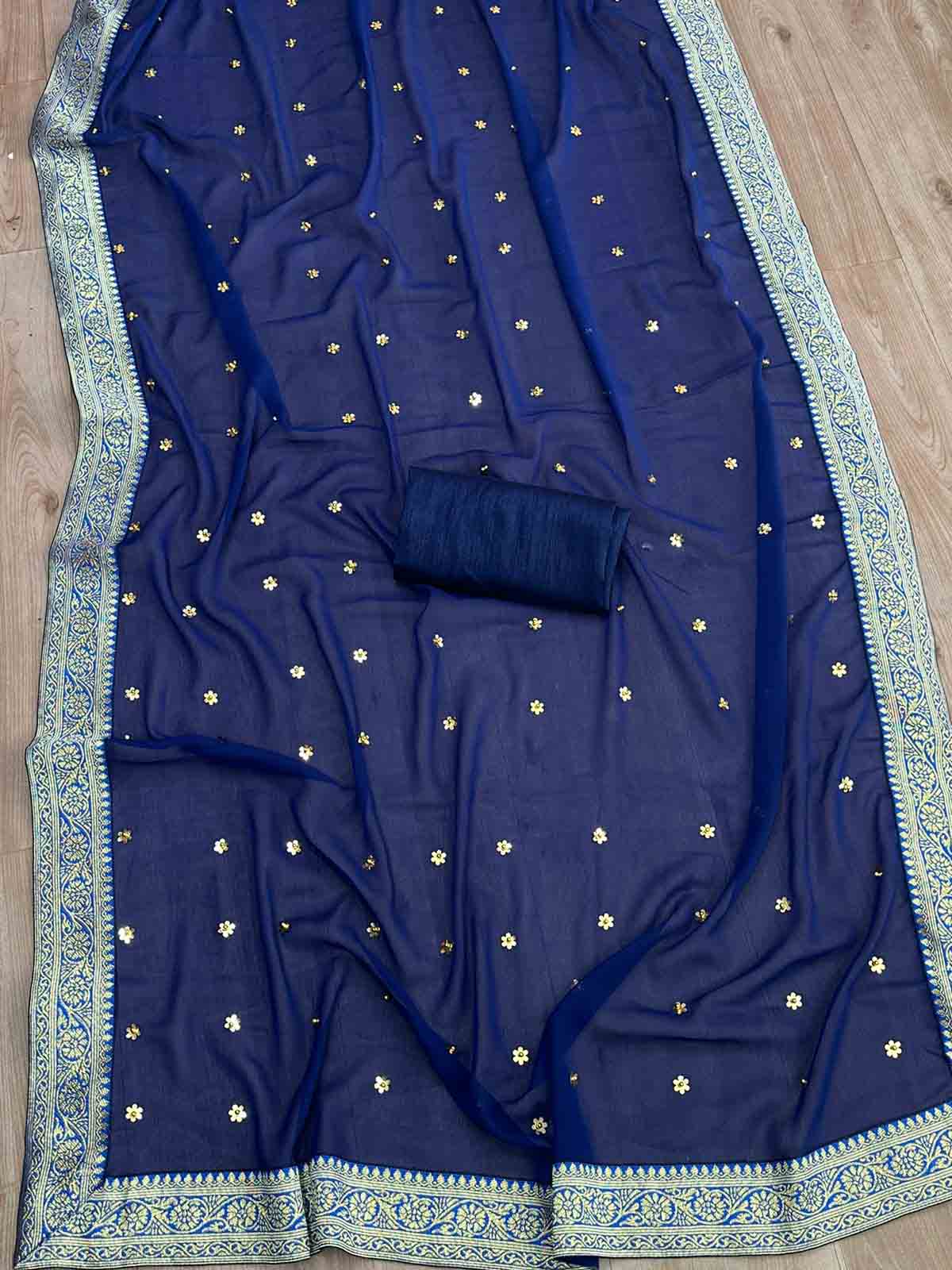 PARTY WEAR GEORGETTE DIAMOND WORK SAREE WITH UNSTITCHED BLOUSE NEVY BLUE