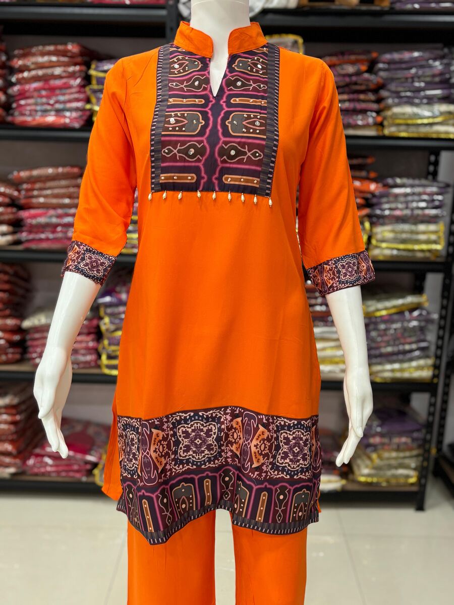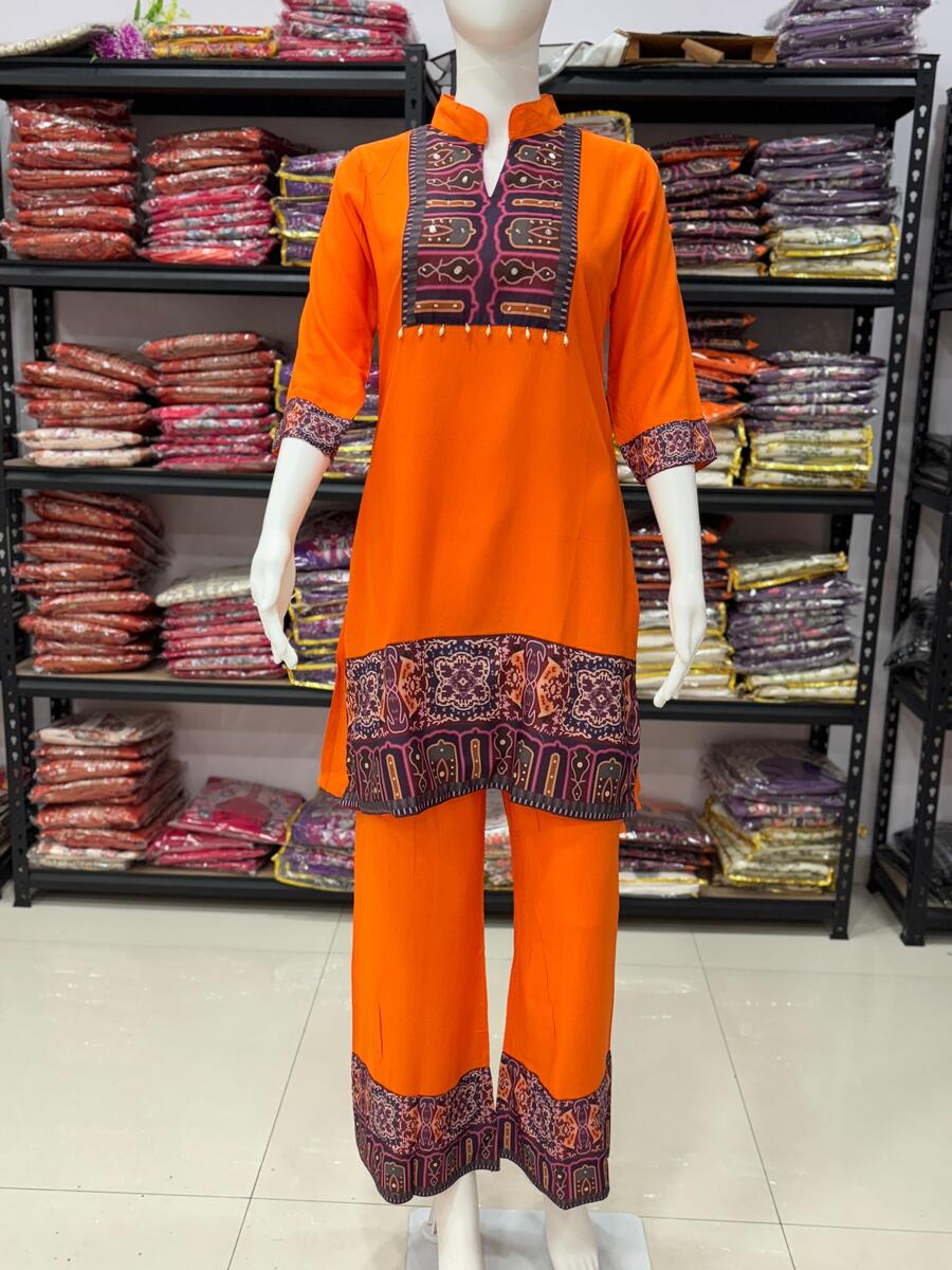 PREMIUM RAYON HAND THREAD AND MOTI WORK WITH SEQUENCE WORK CO-ORD SET ORANGE