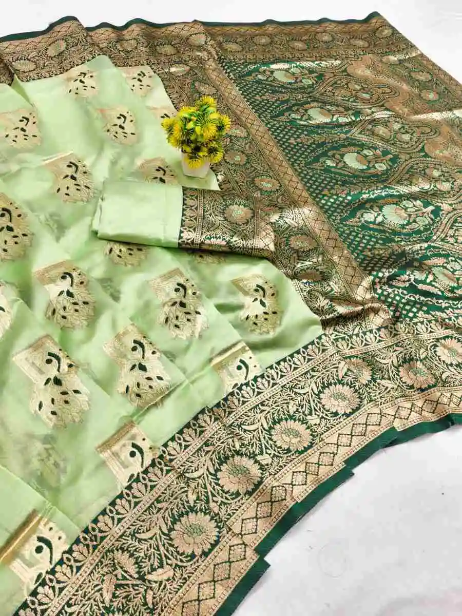 RICH LOOK BANARASI SILK FLOWERS AND MINA & ZARI WEAVING RICH PALLU WITH ZARI WEAVING WORK SAREE WITH UNSTITCHED BLOUSE PISTA