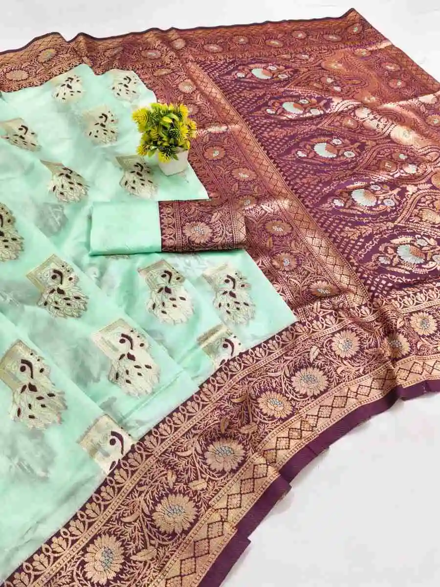 RICH LOOK BANARASI SILK FLOWERS AND MINA & ZARI WEAVING RICH PALLU WITH ZARI WEAVING WORK SAREE WITH UNSTITCHED BLOUSE SEA GREEN