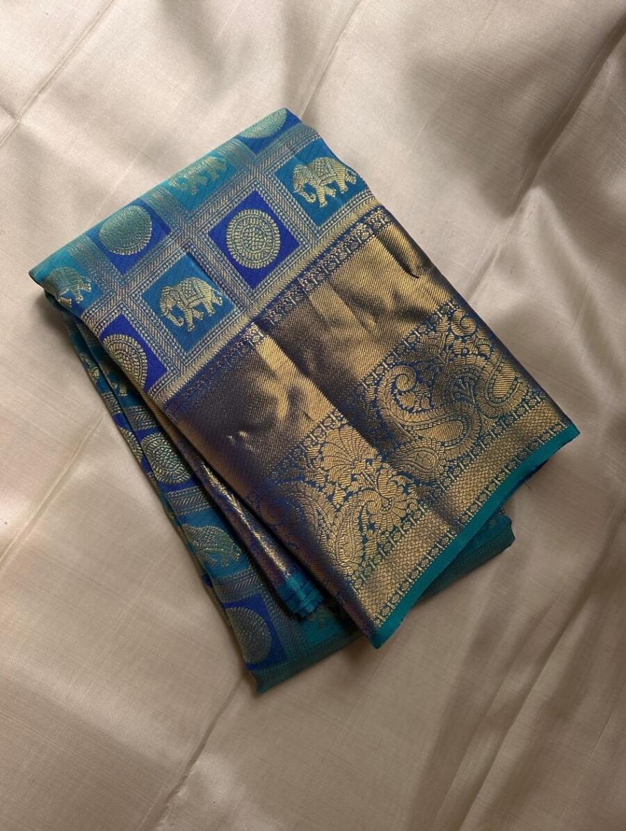 RICH LOOK BANARASI SOFT SILK GOLD ZARI WEAVING WORK SAREE WITH UNSTITCHED BLOUSE TEAL