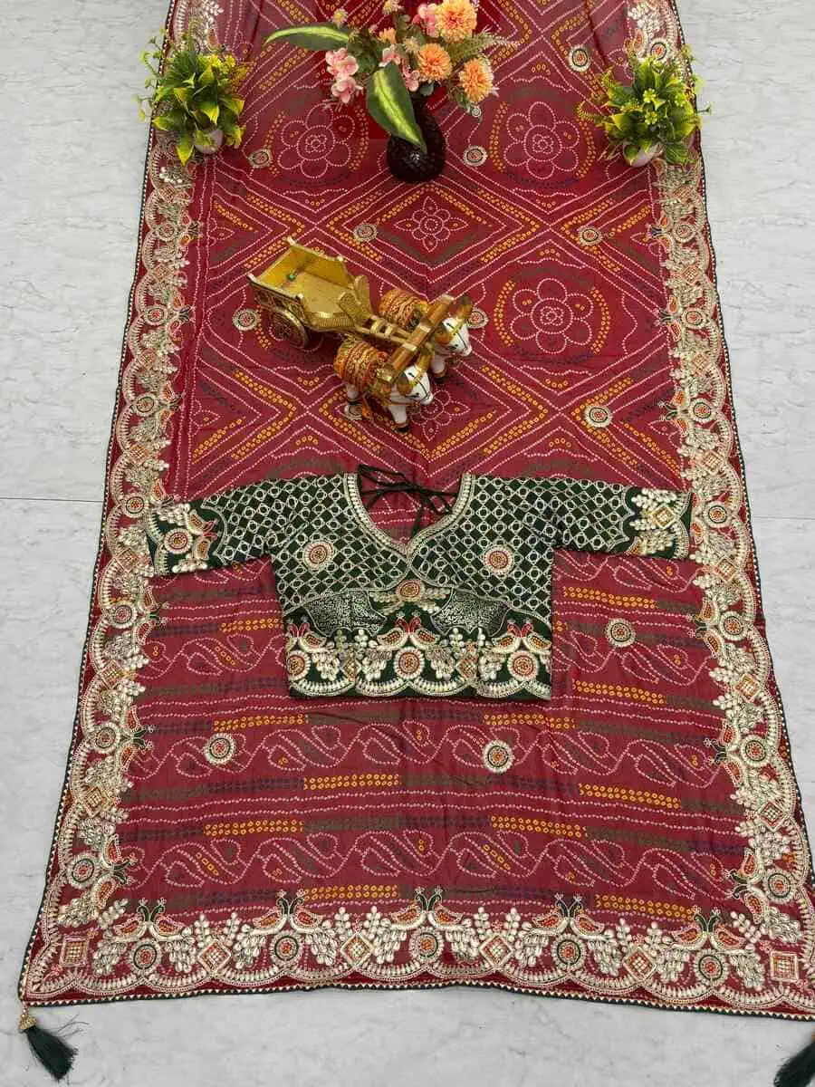 RICH LOOK BHANDEJ PITHA & GOTA PATTI WORK SAREE WITH UNSTITCHED BLOUSE RED