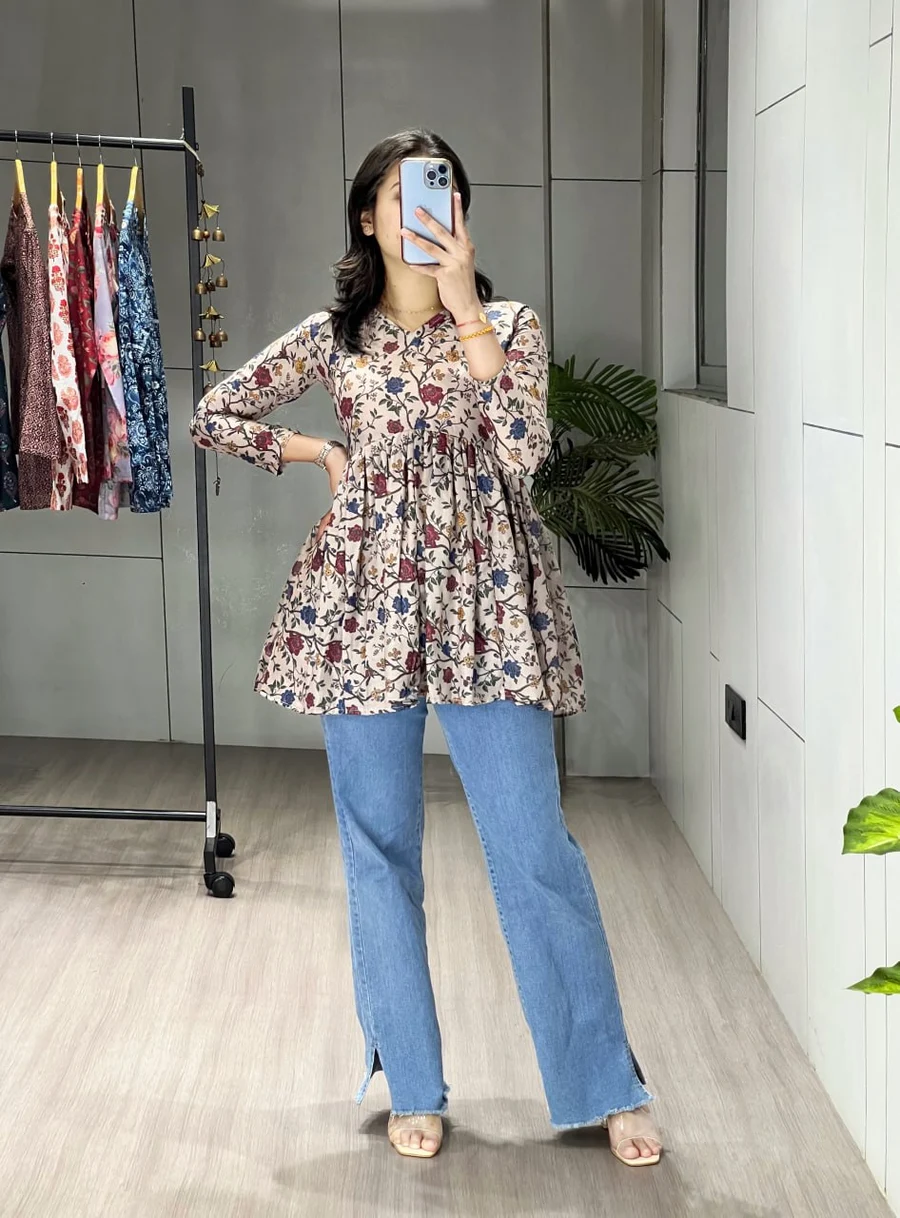 RICH LOOK CAMBRIC COTTON TRADITIONAL FLORAL PRINTED WORK ONLY TOP CREAM
