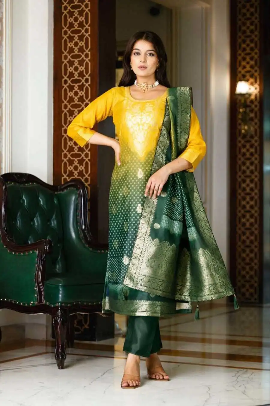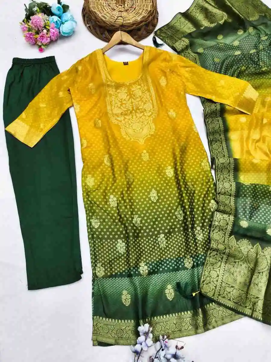 RICH LOOK CHANDERI COTTON WEAVING WORK TOP BOTTOM WITH DUPATTA GREEN AND YELLOW