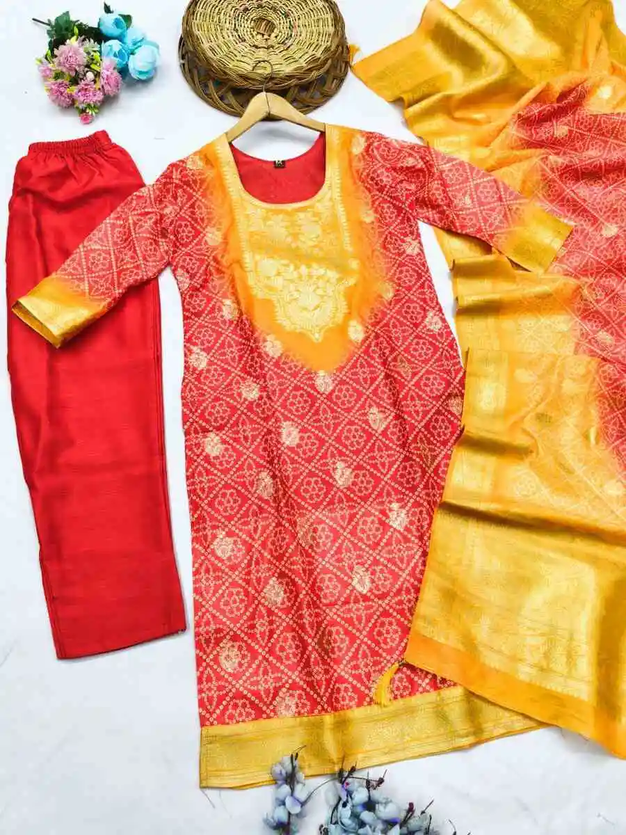 RICH LOOK CHANDERI COTTON WEAVING WORK TOP BOTTOM WITH DUPATTA RED AND YELLOW