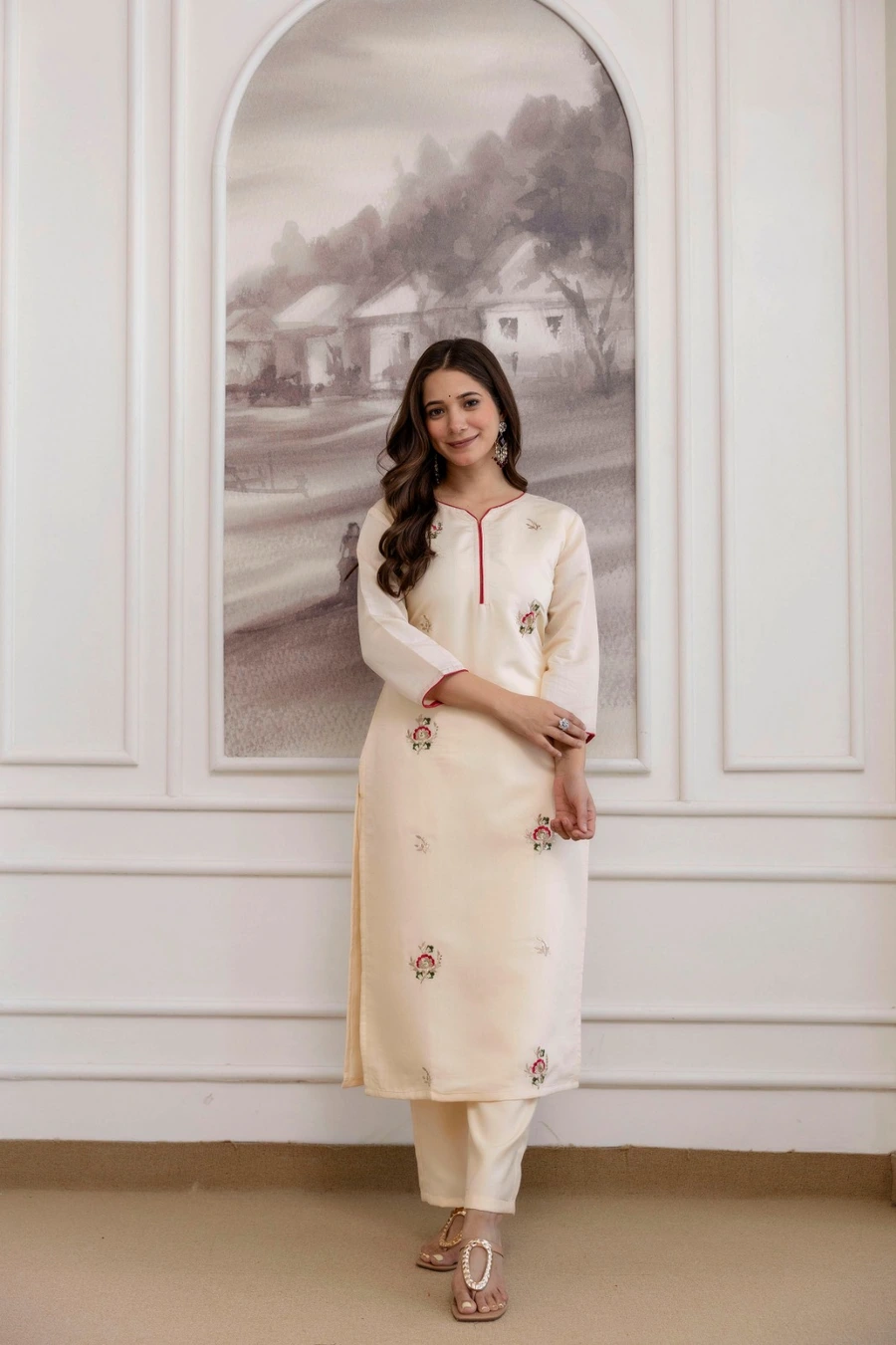 RICH LOOK CHANDERI EMBROIDERY WORK TOP BOTTOM WITH DUPATTA OFF WHITE AND RED