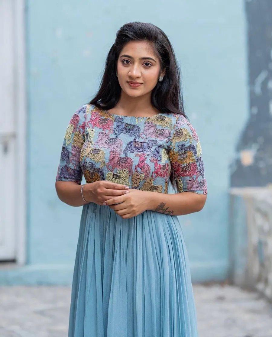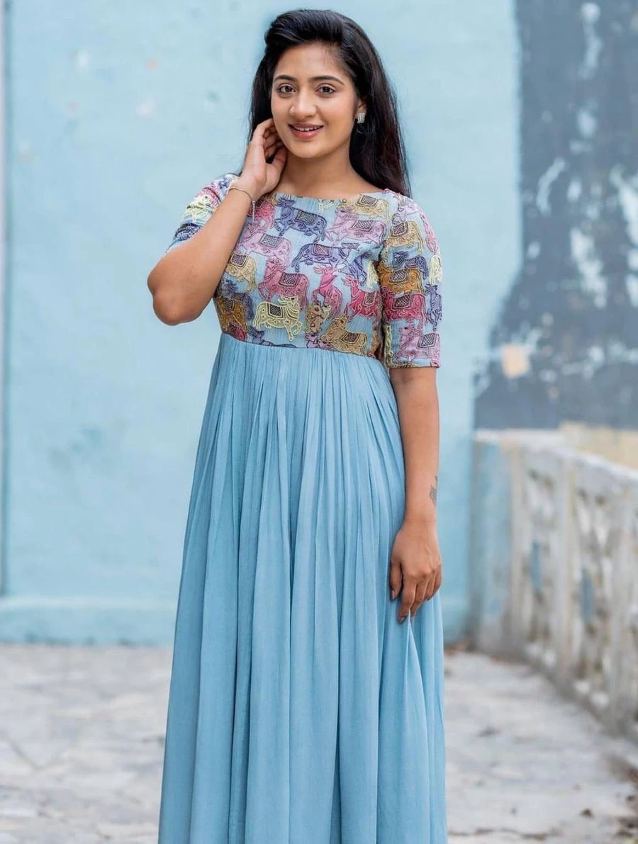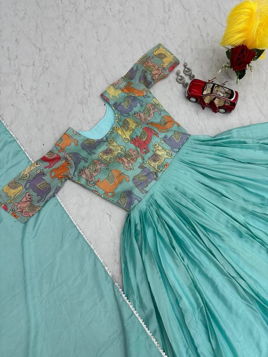 RICH LOOK CHINON HANDWORK & KALAMKARI PRINT WORK GOWN WITH DUPATTA SKY