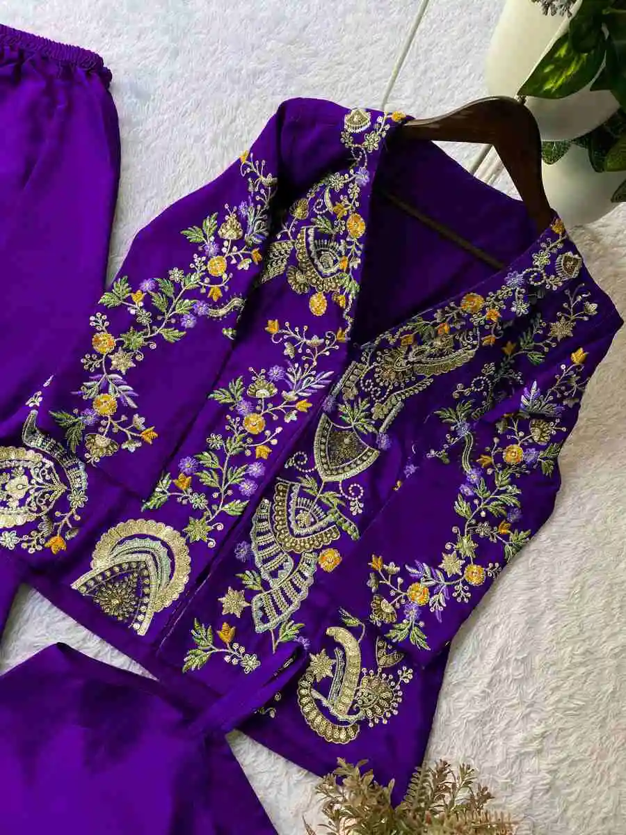 RICH LOOK CHINON SEQUENCE EMBROIDERY WORK BLOUSE KOTI WITH PALAZZO PURPLE