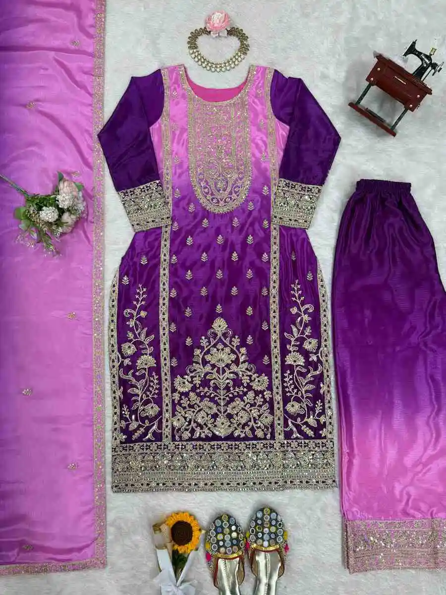 RICH LOOK CHINON SILK CODING DORI WITH SEQUENCE THREAD WORK TOP PALAZZO WITH DUPATTA PURPLE