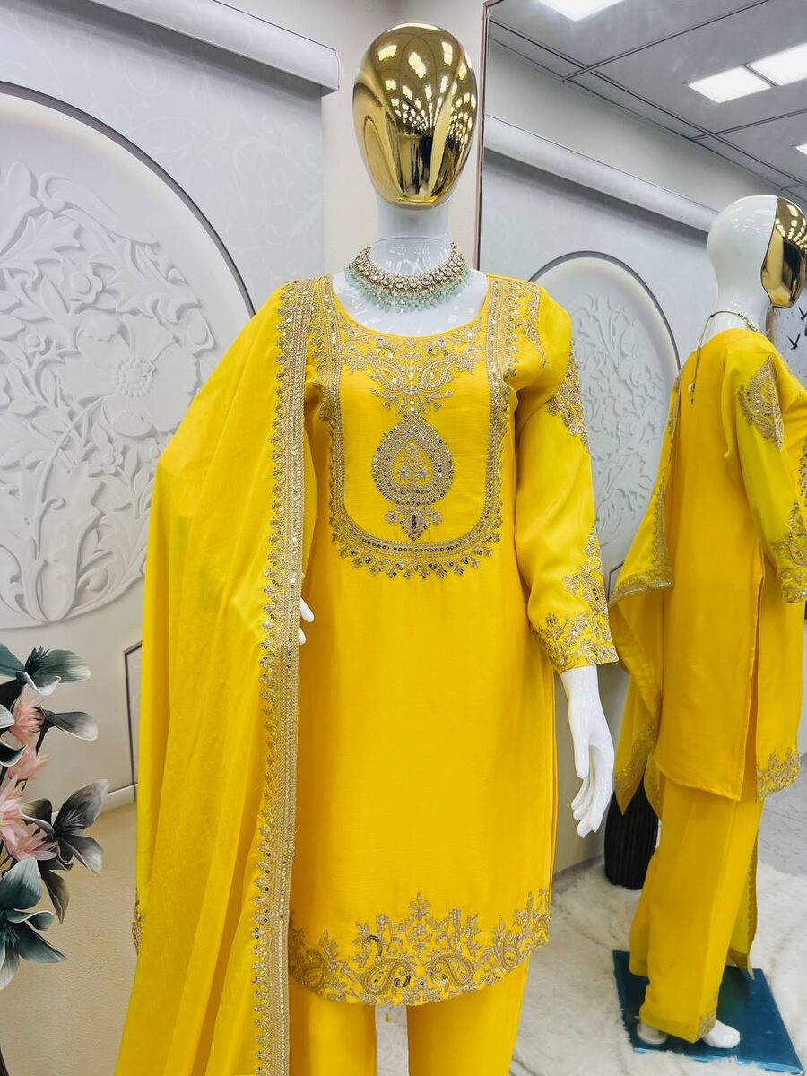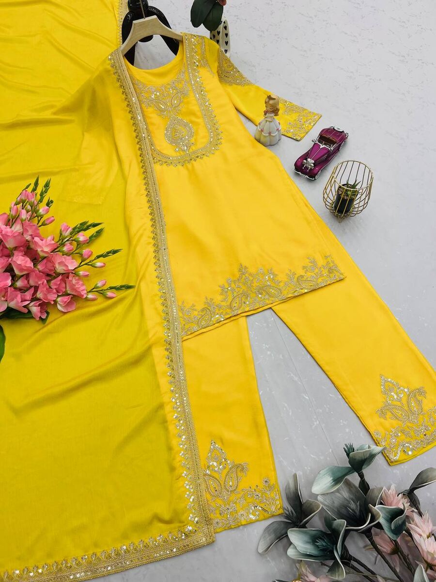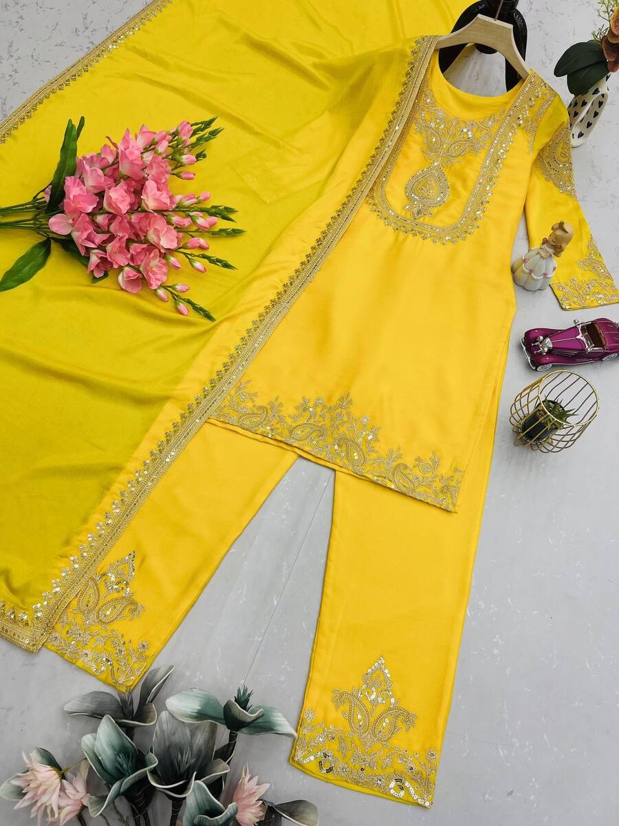 RICH LOOK CHINON SILK EMBROIDERY CODING & SEQUENCE WORK TOP BOTTOM WITH DUPATTA YELLOW