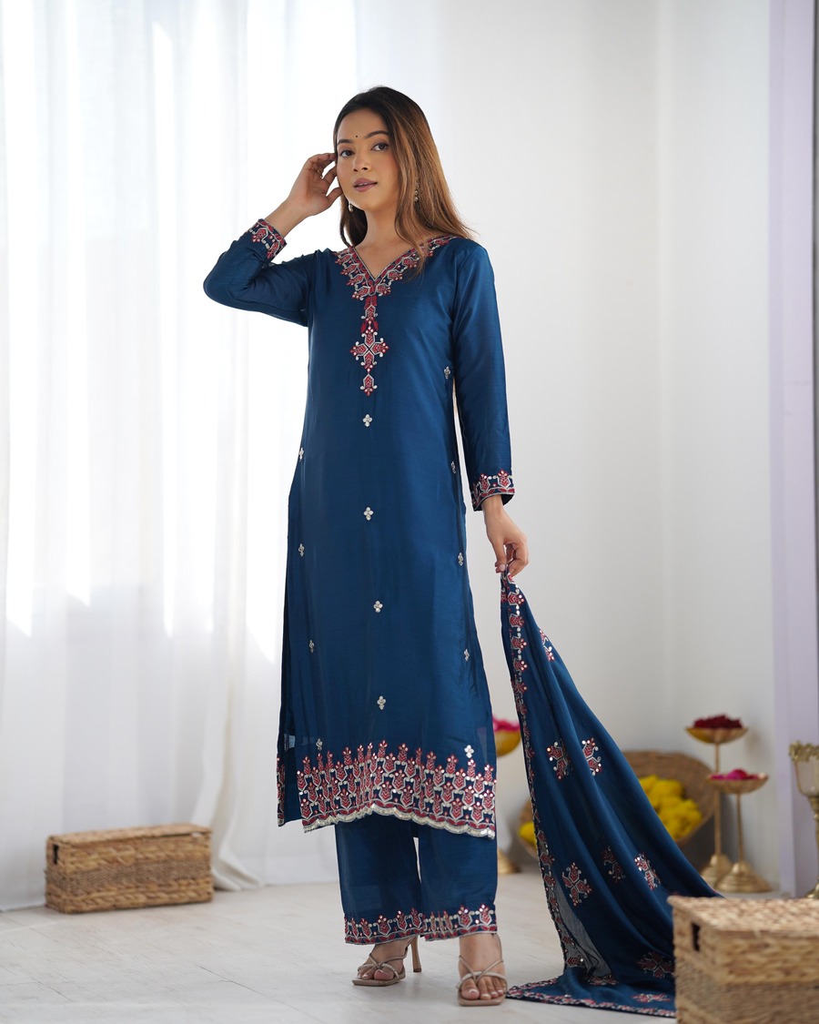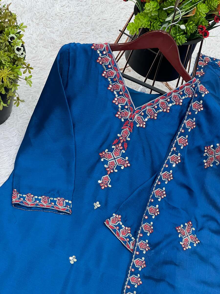 RICH LOOK CHINON SILK EMBROIDERY SEQUENCE WORK AND HEAVY LACE WORK TOP BOTTOM WITH DUPATTA BLUE