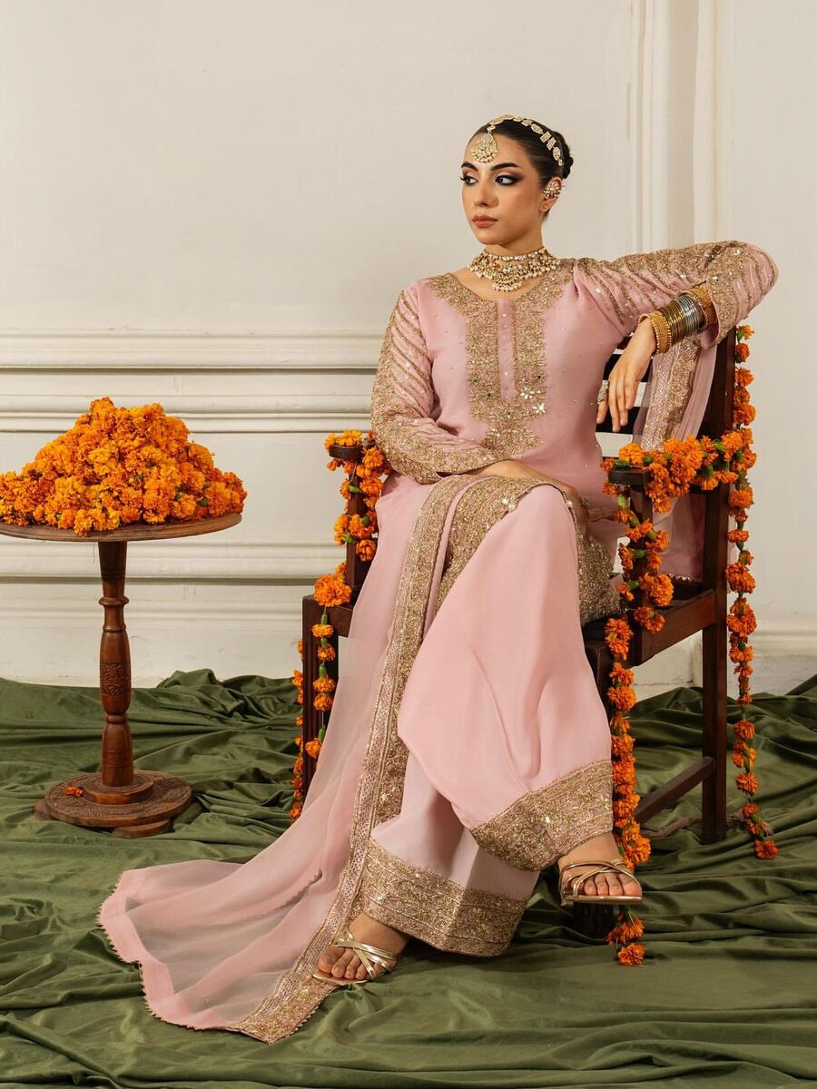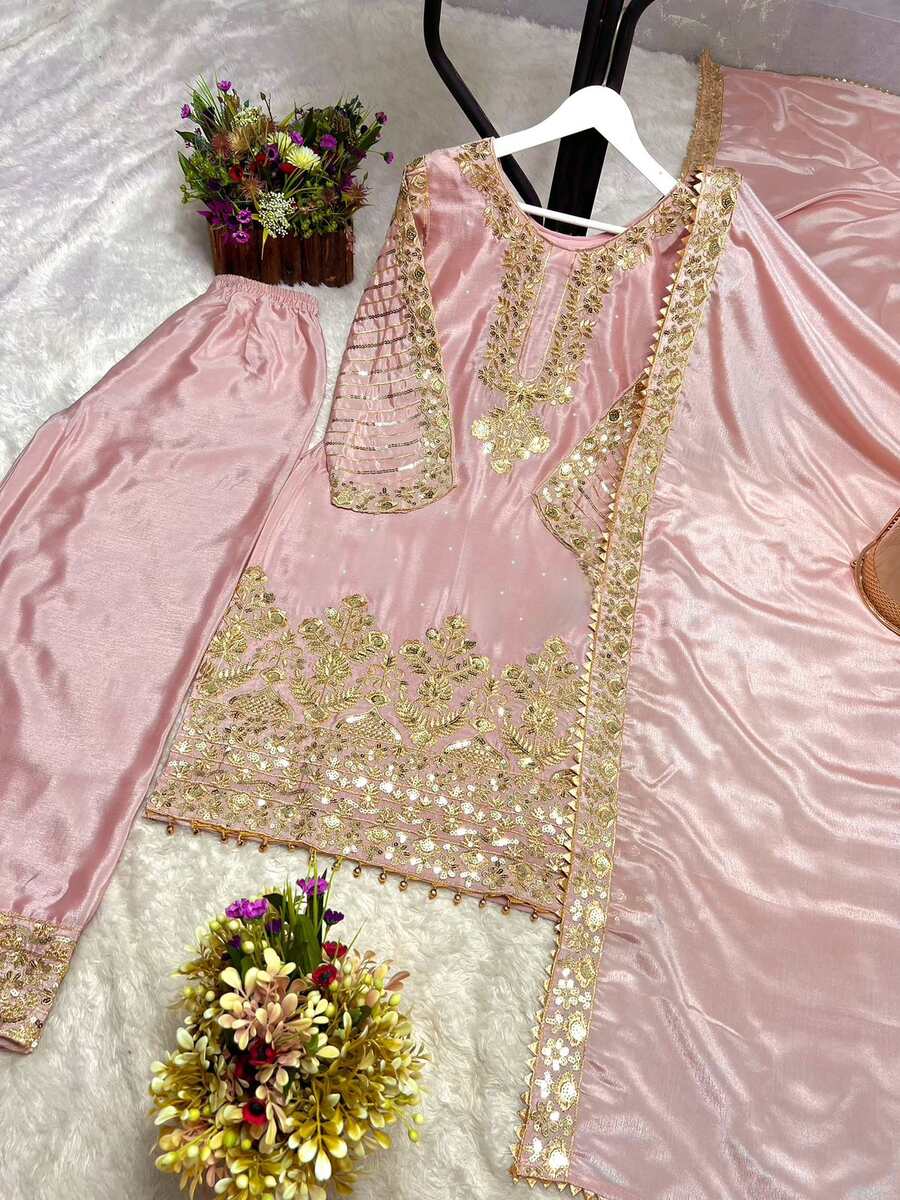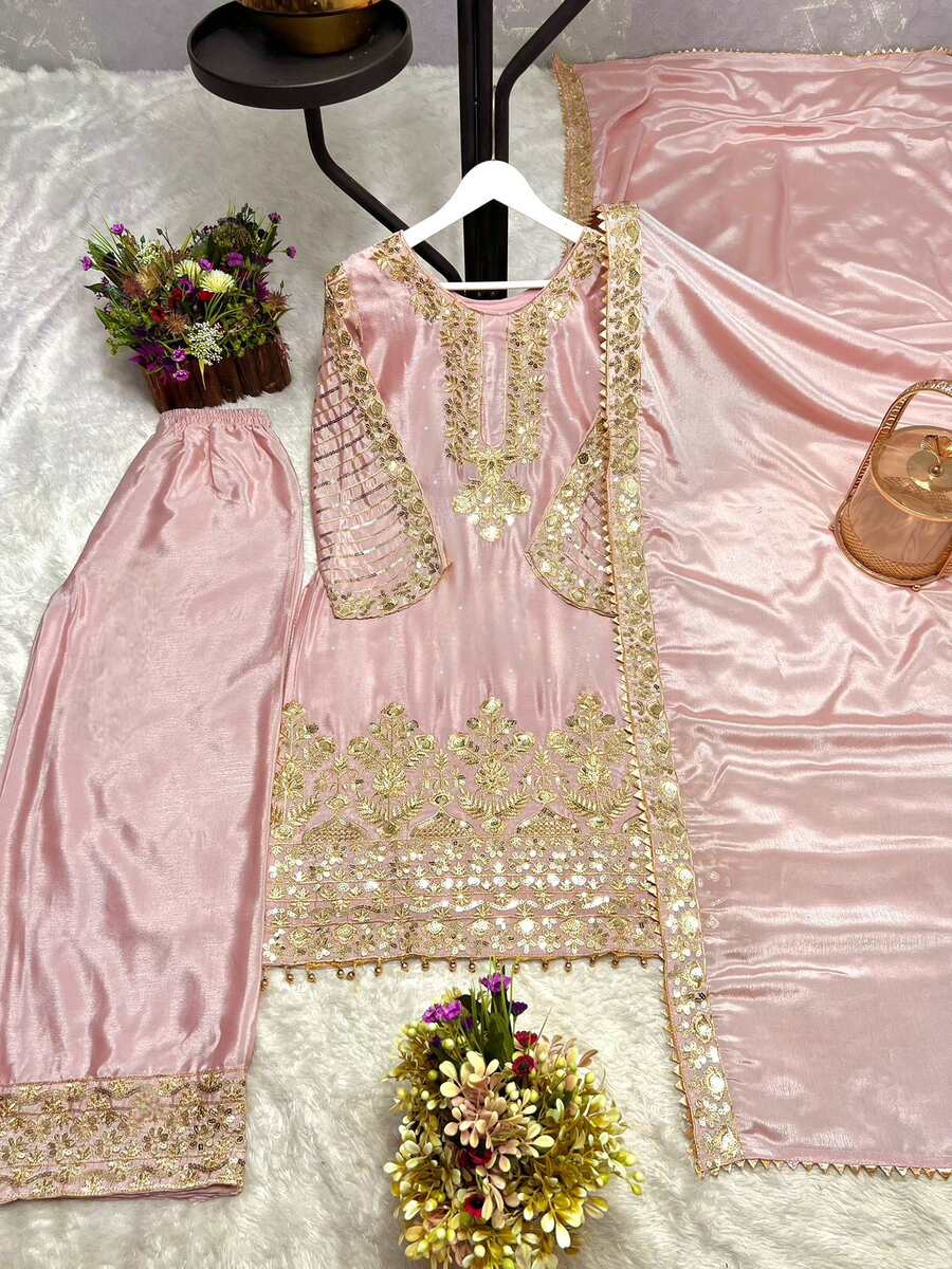 RICH LOOK CHINON SILK EMBROIDERY SEQUENCE WORK AND READY MADE LACE BORDER WORK TOP PALAZZO WITH DUPATTA BABY PINK