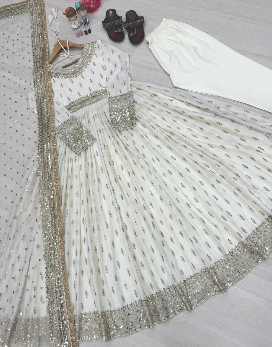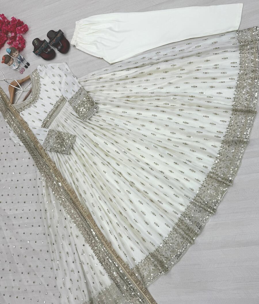RICH LOOK CHINON SILK EMBROIDERY SEQUENEC WORK GOWN BOTTOM WITH DUPATTA WHITE