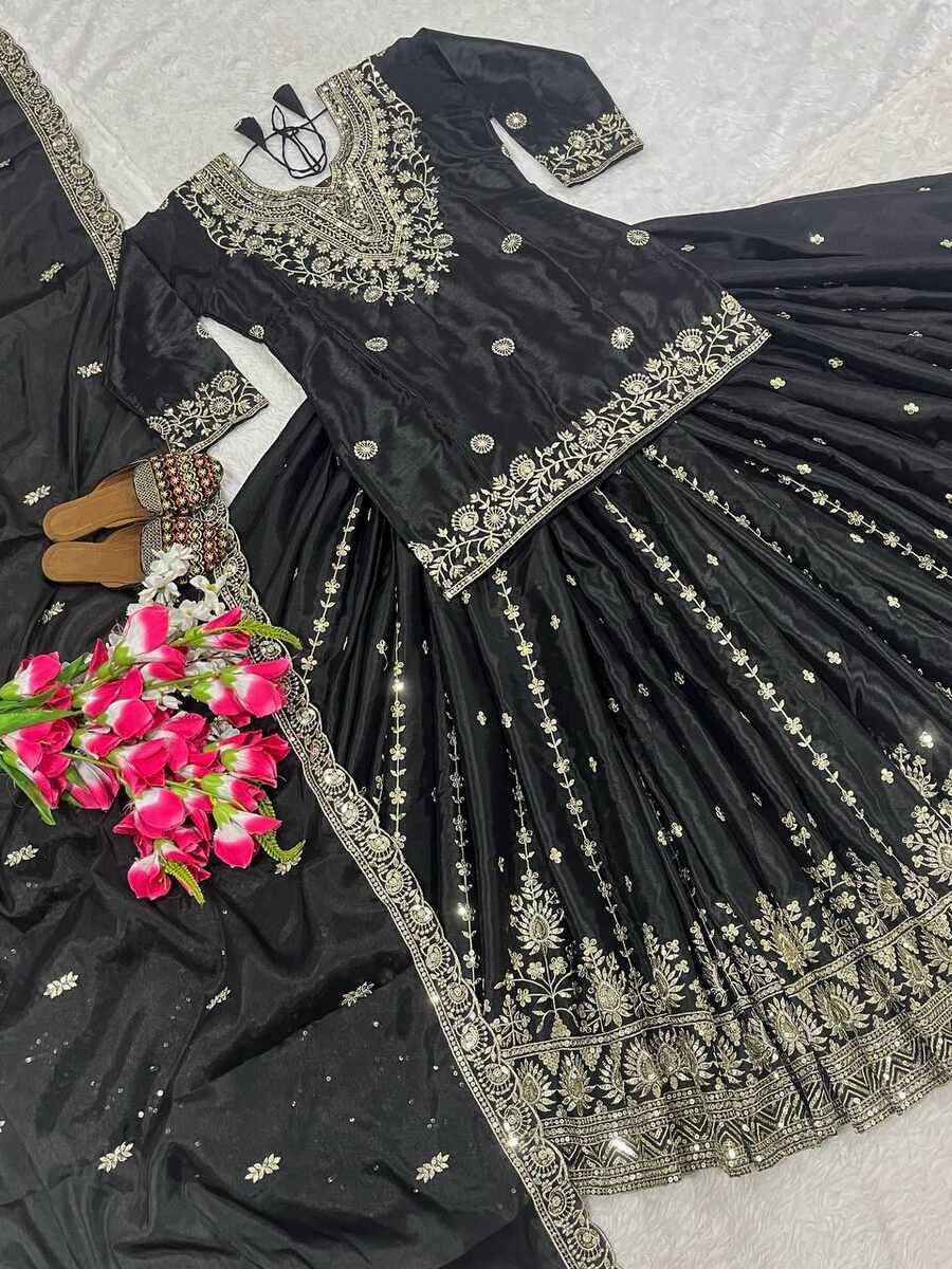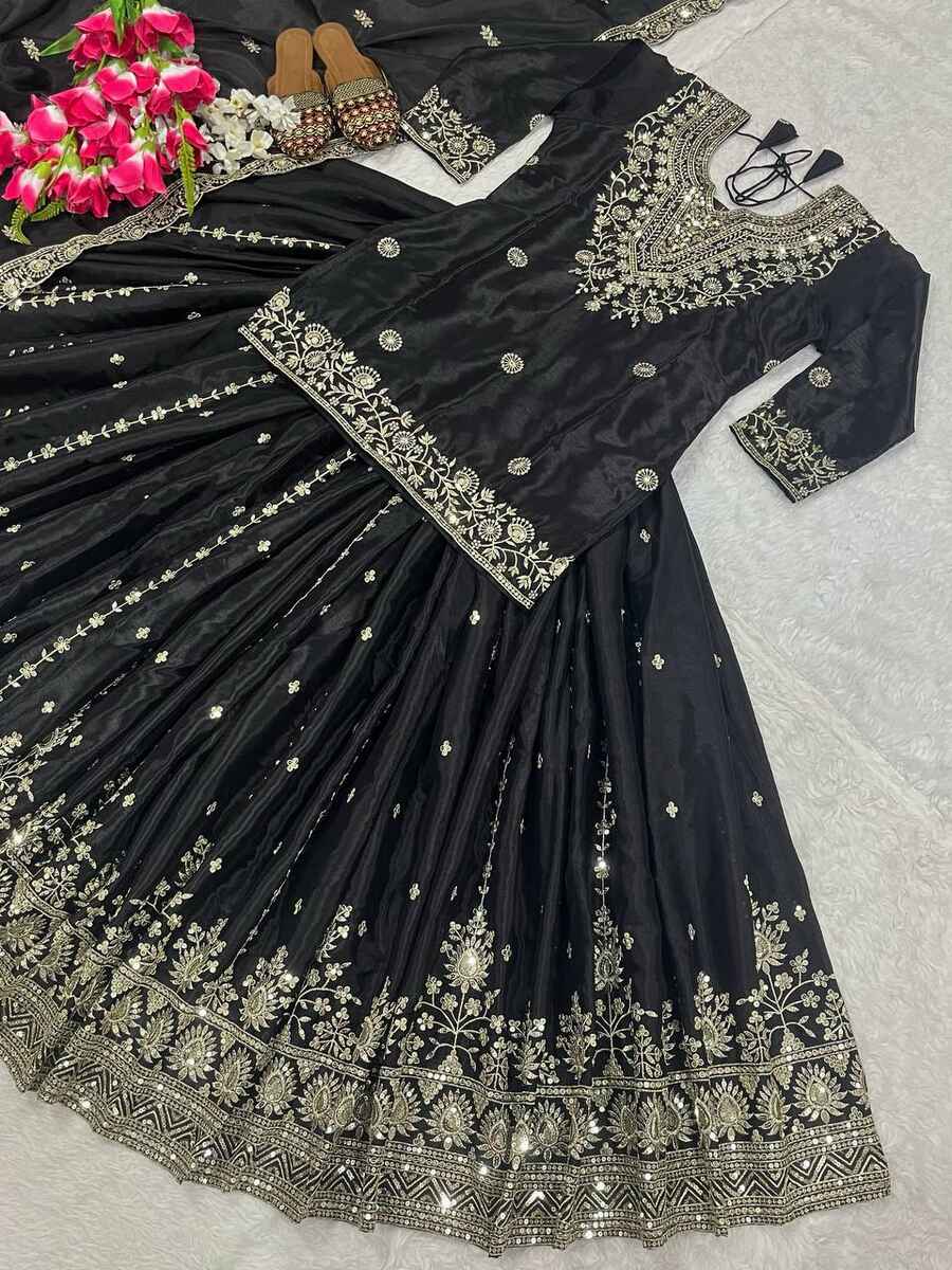 RICH LOOK CHINON SILK EMBROIDERY WITH SEQUENCE WORK TOP LEHENGA WITH DUPATTA BLACK