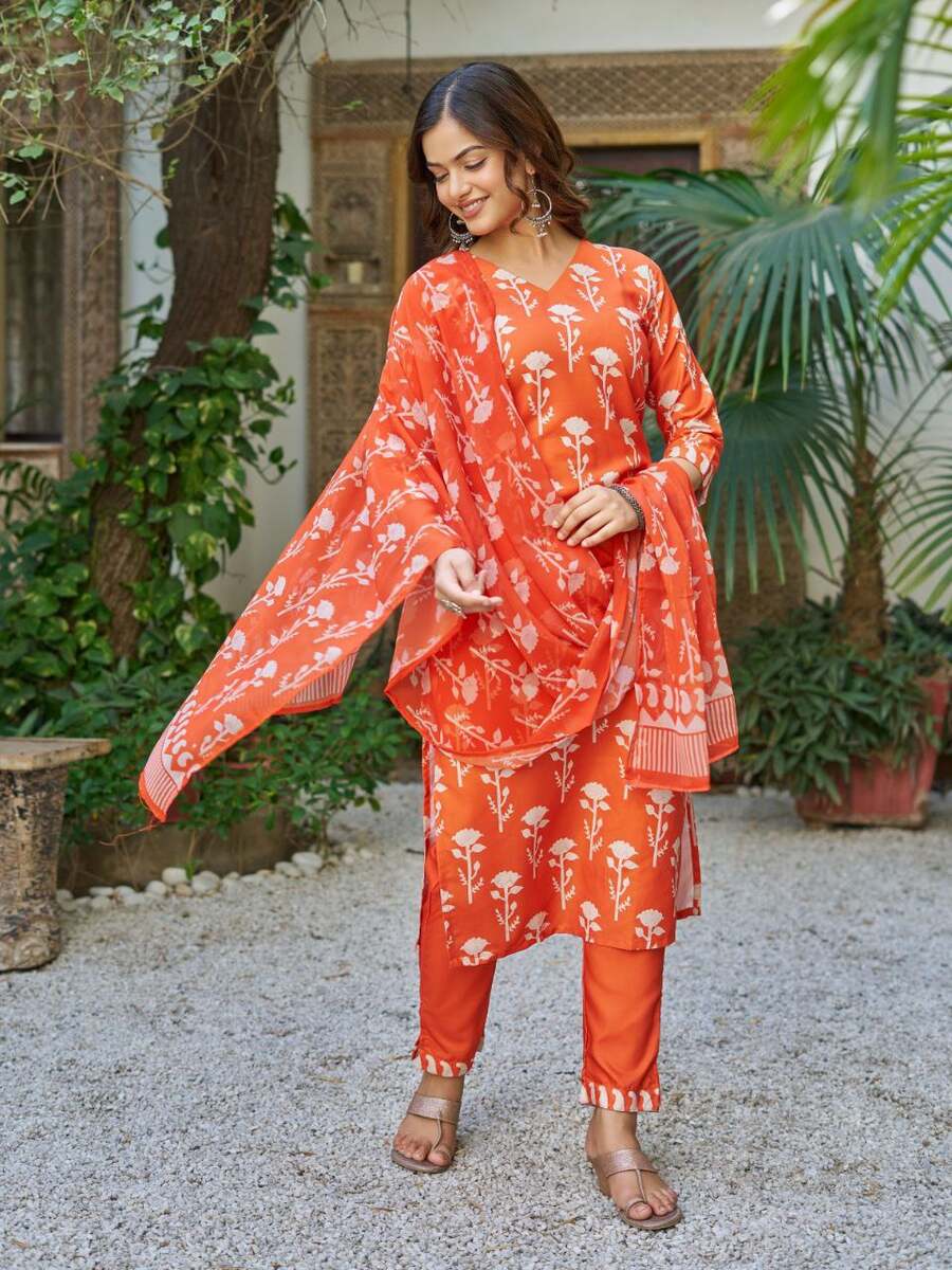 RICH LOOK COTTON BLEND PRINTED WORK TOP BOTTOM WITH DUPATTA ORANGE