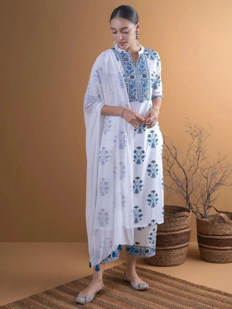 RICH LOOK COTTON BLEND PRINTED WORK TOP BOTTOM WITH DUPATTA WHITE