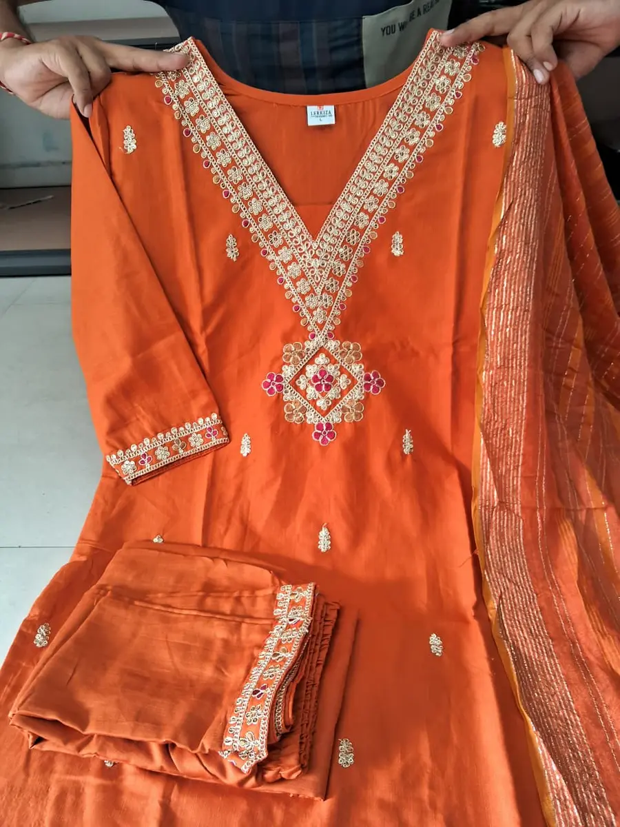 RICH LOOK COTTON EMBROIDERY SEQUENCE WORK TOP BOTTOM WITH DUPATTA ORANGE