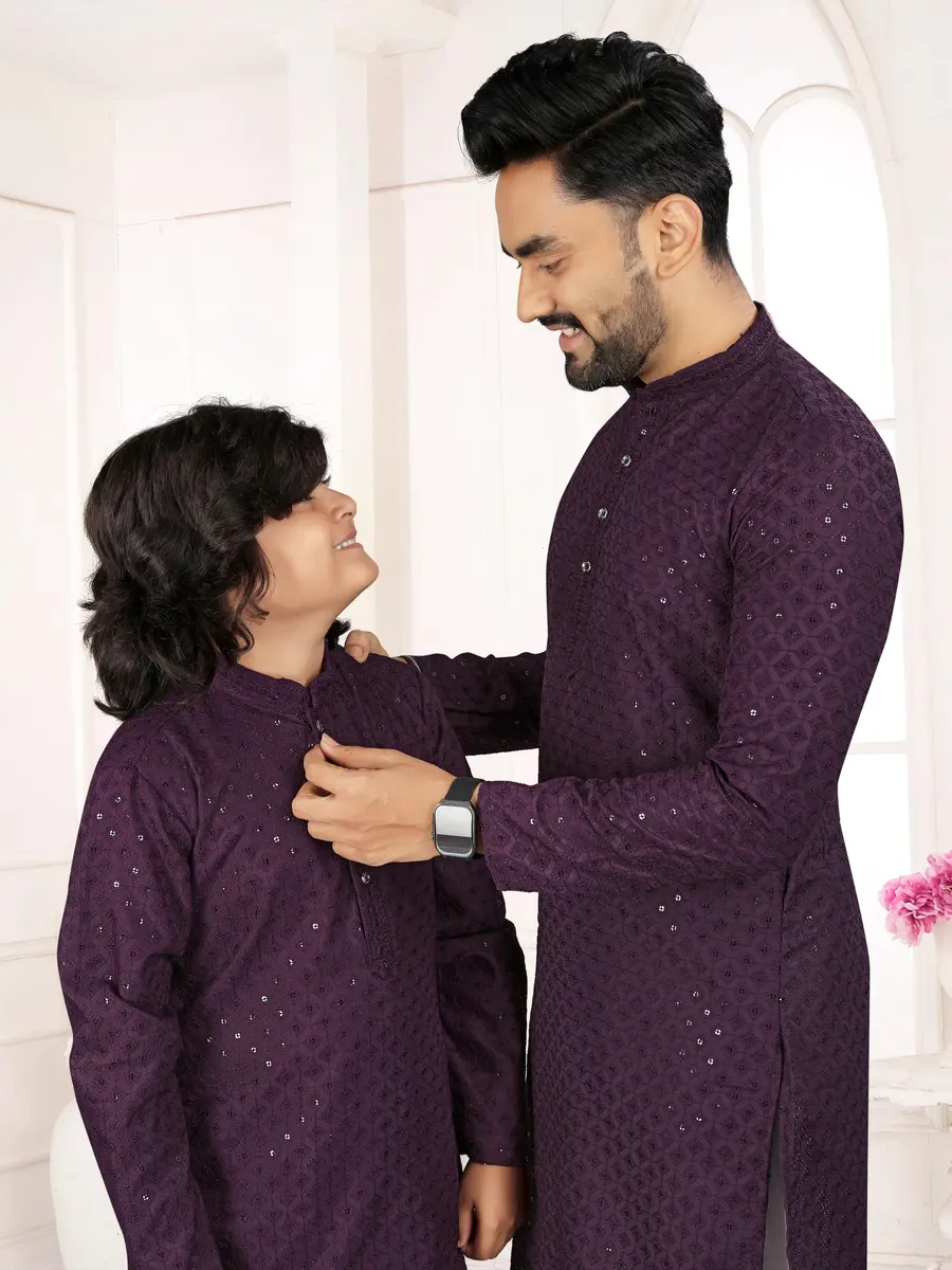 RICH LOOK COTTON RAYON MACHINE EMBROIDERY WORK FATHER SON COMBO SET WINE