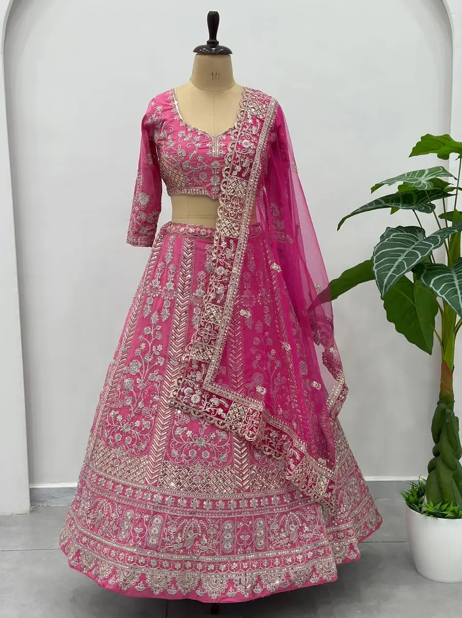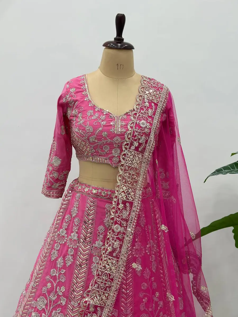 RICH LOOK CREAP SILK SEQUENCE AND CODING JARI EMBROIDERY WORK LEHENGA CHOLI WITH DUPATTA PINK