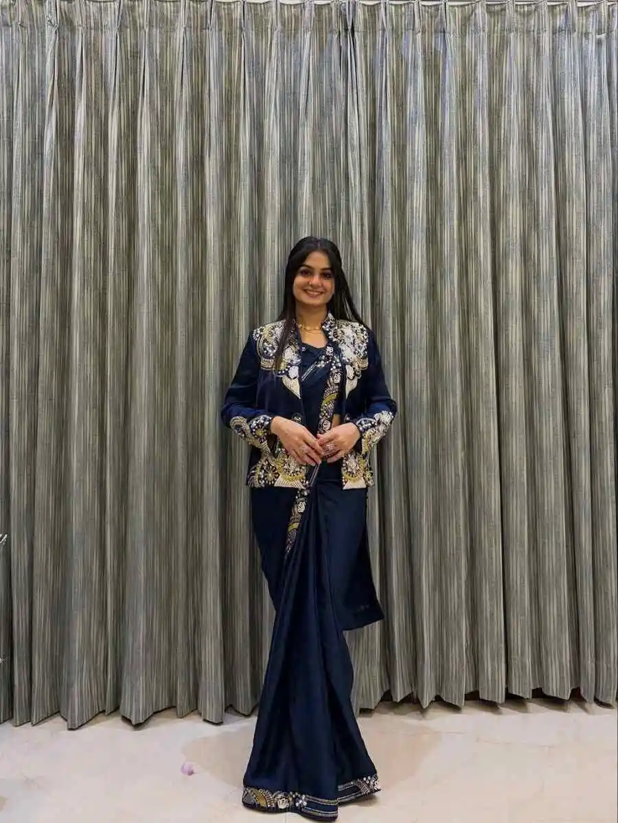 RICH LOOK CREPE EMBROIDERY SEQUENCE CODING WORK READY TO WEAR SAREE WITH BLOUSE AND KOTI NAVY BLUE