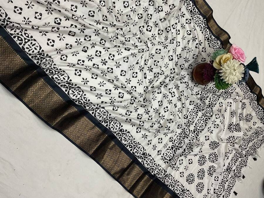 RICH LOOK DOLA SILK JACQUARD WEAVING BORDER AND BATIK PRINT WORK SAREE WITH UNSTITCHED BLOUSE BLACK