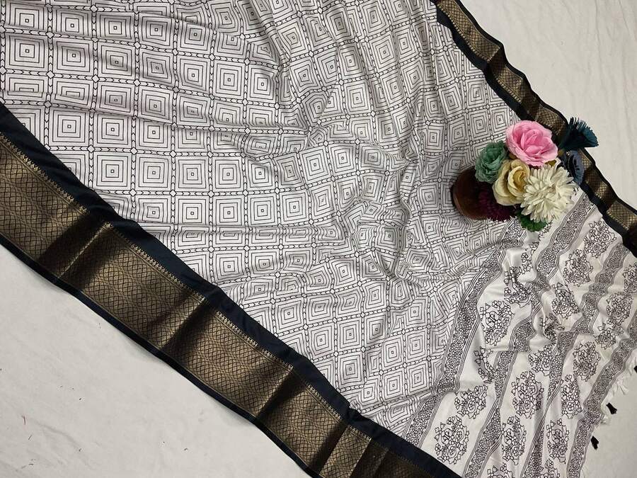 RICH LOOK DOLA SILK JACQUARD WEAVING BORDER AND BATIK PRINT WORK SAREE WITH UNSTITCHED BLOUSE BLACK