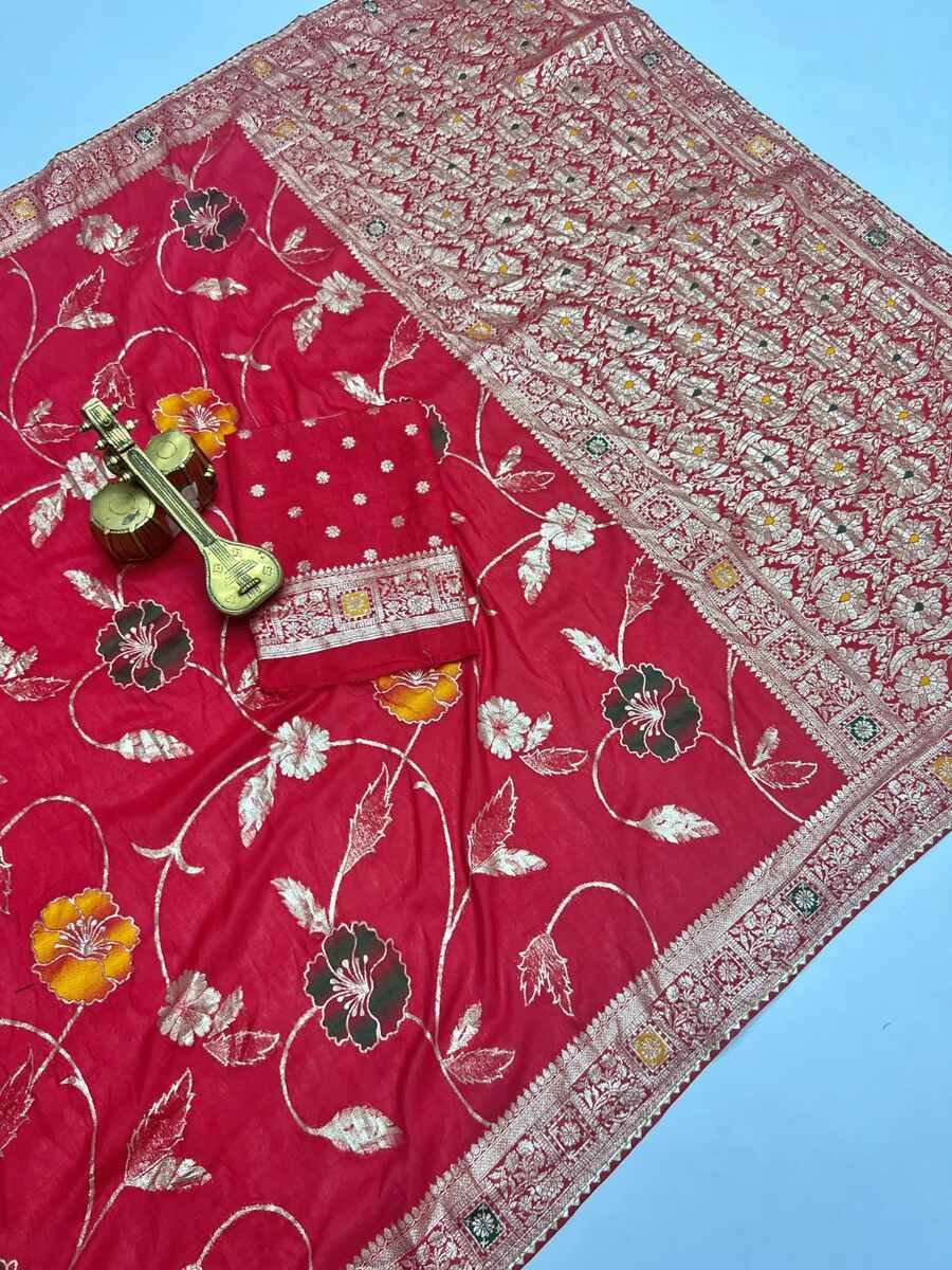 RICH LOOK DOLA SILK ZARI & MEENAKARI WEAVING WITH PIPING LACE BORDER WORK SAREE WITH UNSTITCHED BLOUSE RED