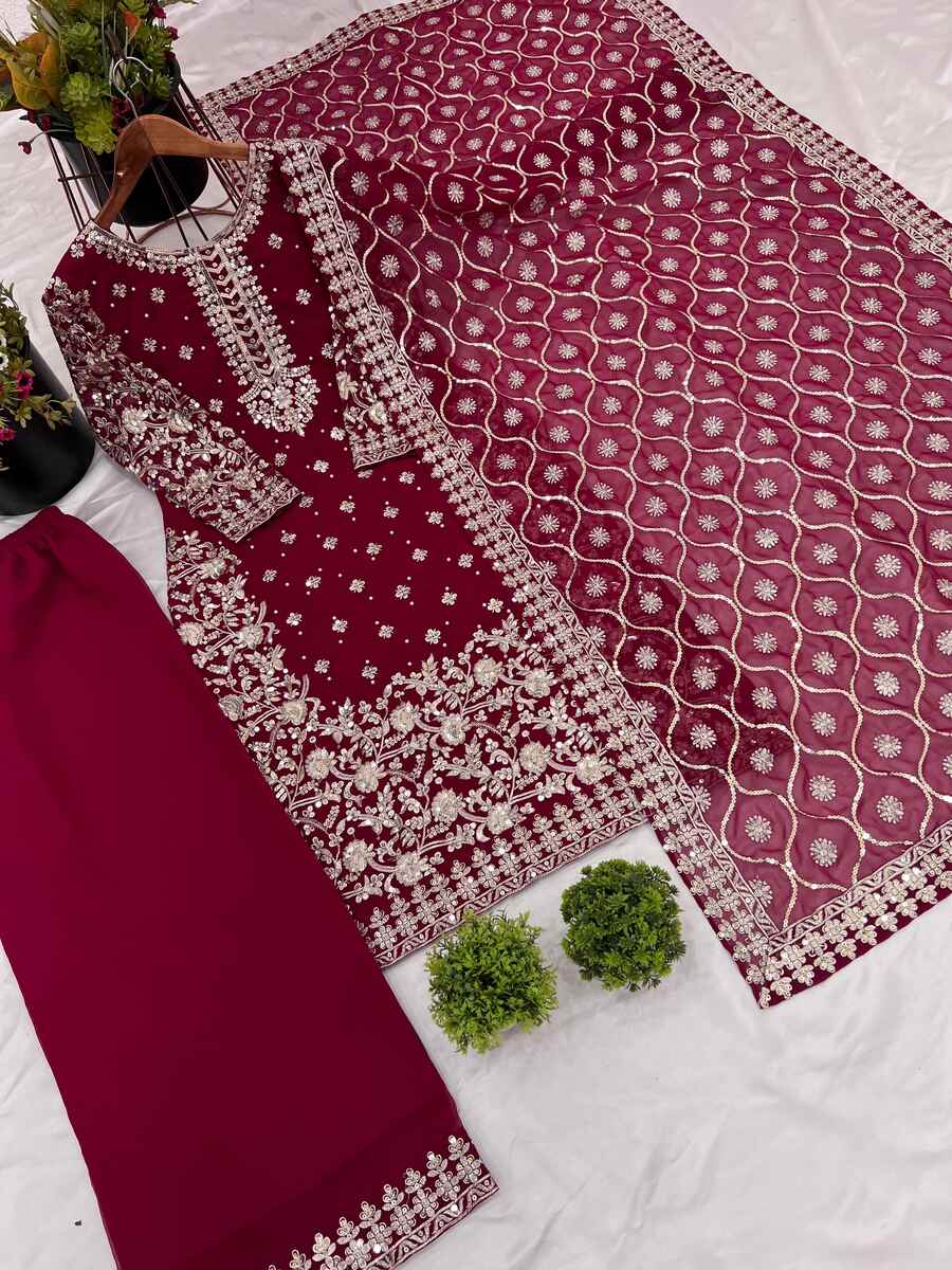 RICH LOOK FAUX GEORGETTE EMBROIDERY SEQUENCE AND BEADS WORK TOP PALAZZO WITH DUPATTA RED