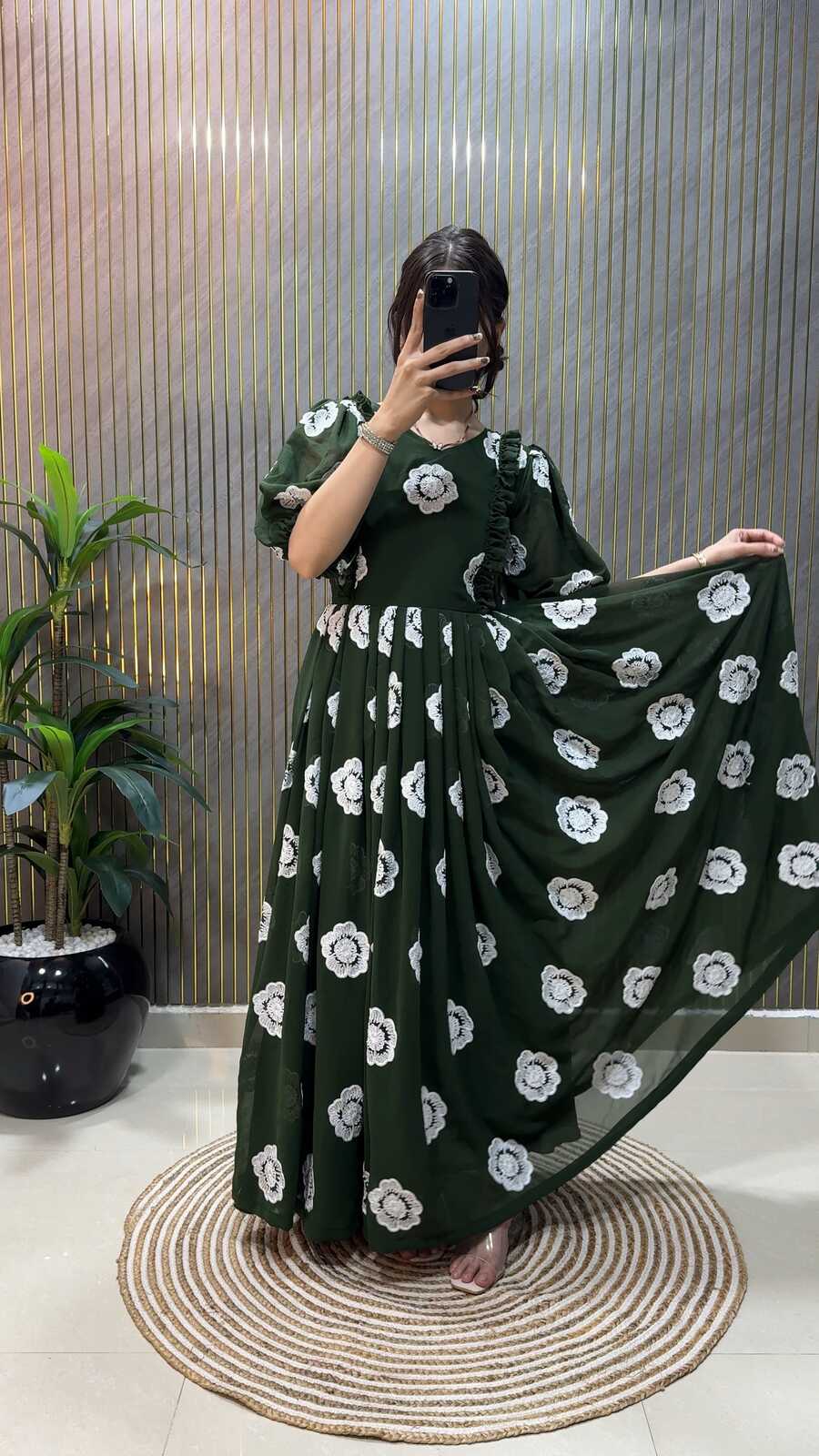 RICH LOOK FAUX GEORGETTE THREAD WORK ONE PIECE DRESS GREEN