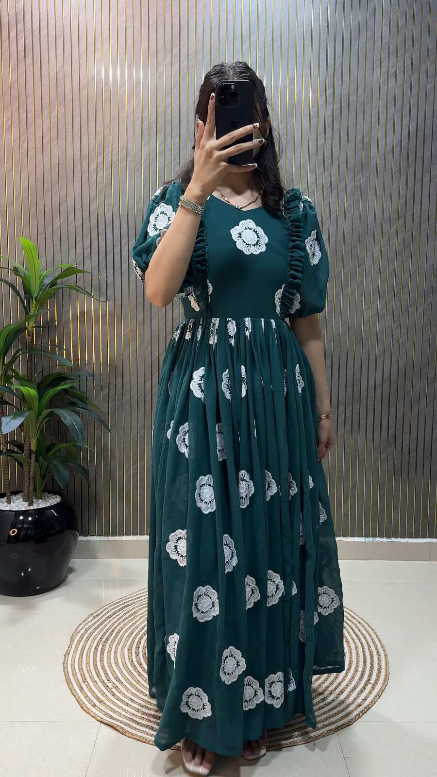 RICH LOOK FAUX GEORGETTE THREAD WORK ONE PIECE DRESS TEAL
