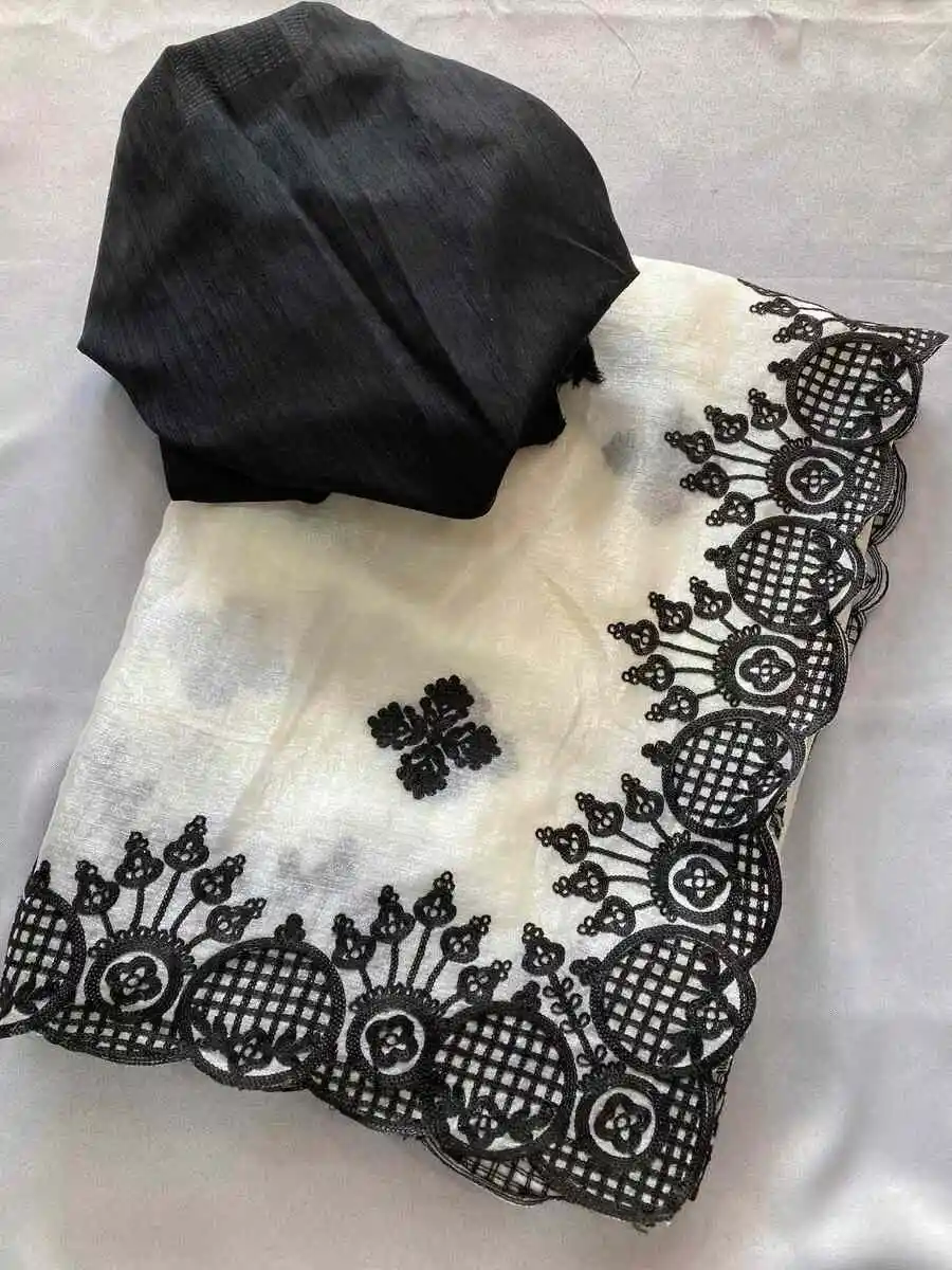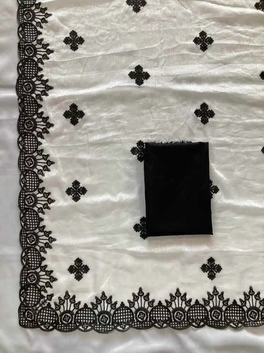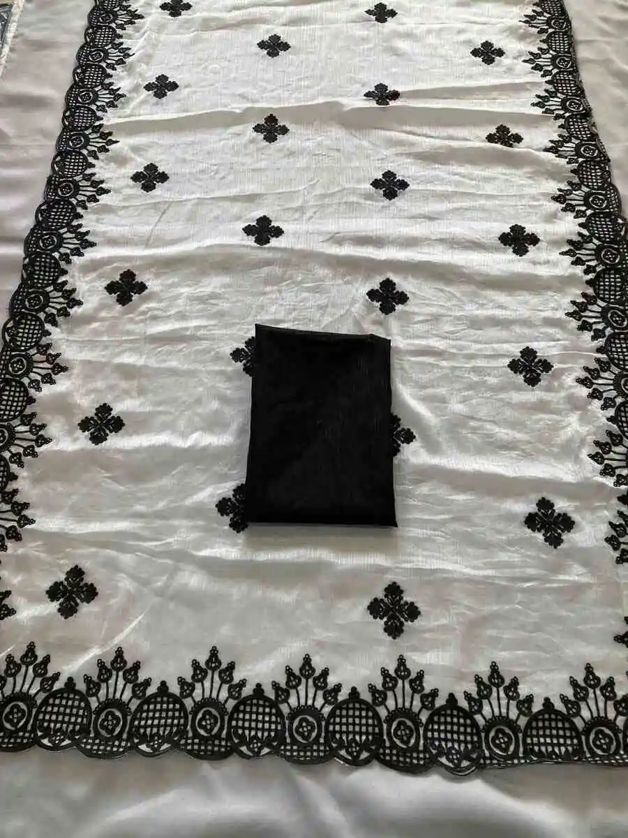 RICH LOOK FENDY CHIFFON EMBROIDERY BORDER WORK SAREE WITH UNSTITCHED BLOUSE OFF WHITE