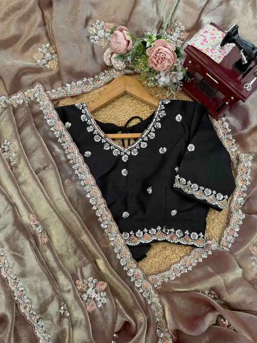 SAREE FABRIC : PURE SOFT TABBY ORGANZA WITH HEAVY EMBROIDERY MULTI TREADS , CODING & SEQUENCE WORK & FANCY CUT WORK BORDER