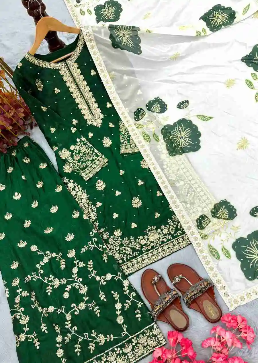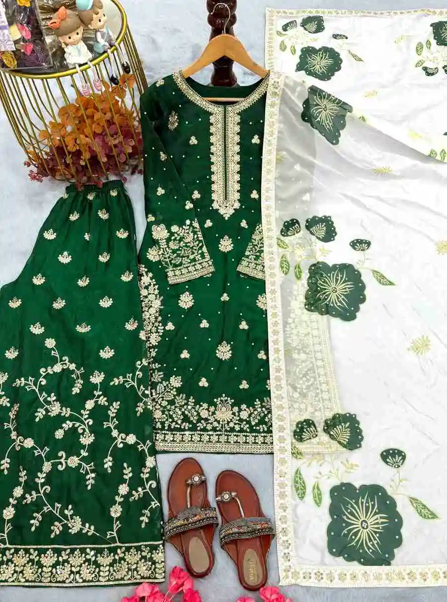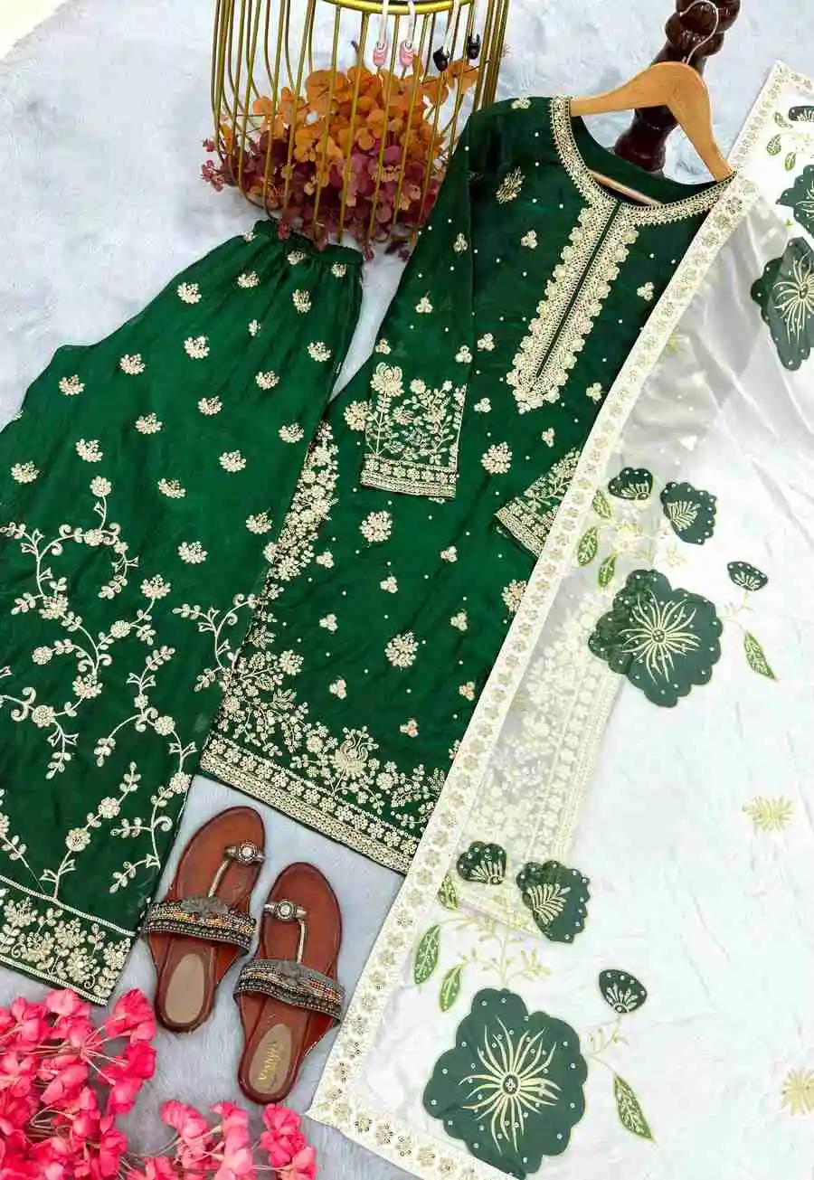 RICH LOOK FENDY SILK EMBROIDERY SEQUENCE WORK WITH RIVET MOTI WORK TOP PALAZZO WITH DUPATTA GREEN