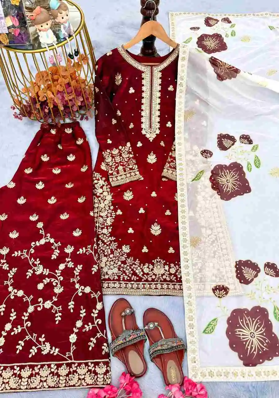 RICH LOOK FENDY SILK EMBROIDERY SEQUENCE WORK WITH RIVET MOTI WORK TOP PALAZZO WITH DUPATTA MAROON