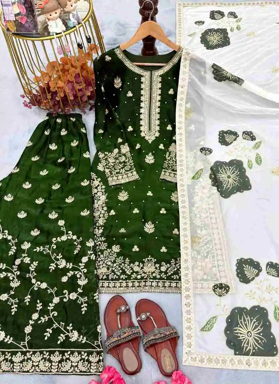 RICH LOOK FENDY SILK EMBROIDERY SEQUENCE WORK WITH RIVET MOTI WORK TOP PALAZZO WITH DUPATTA MEHNDI
