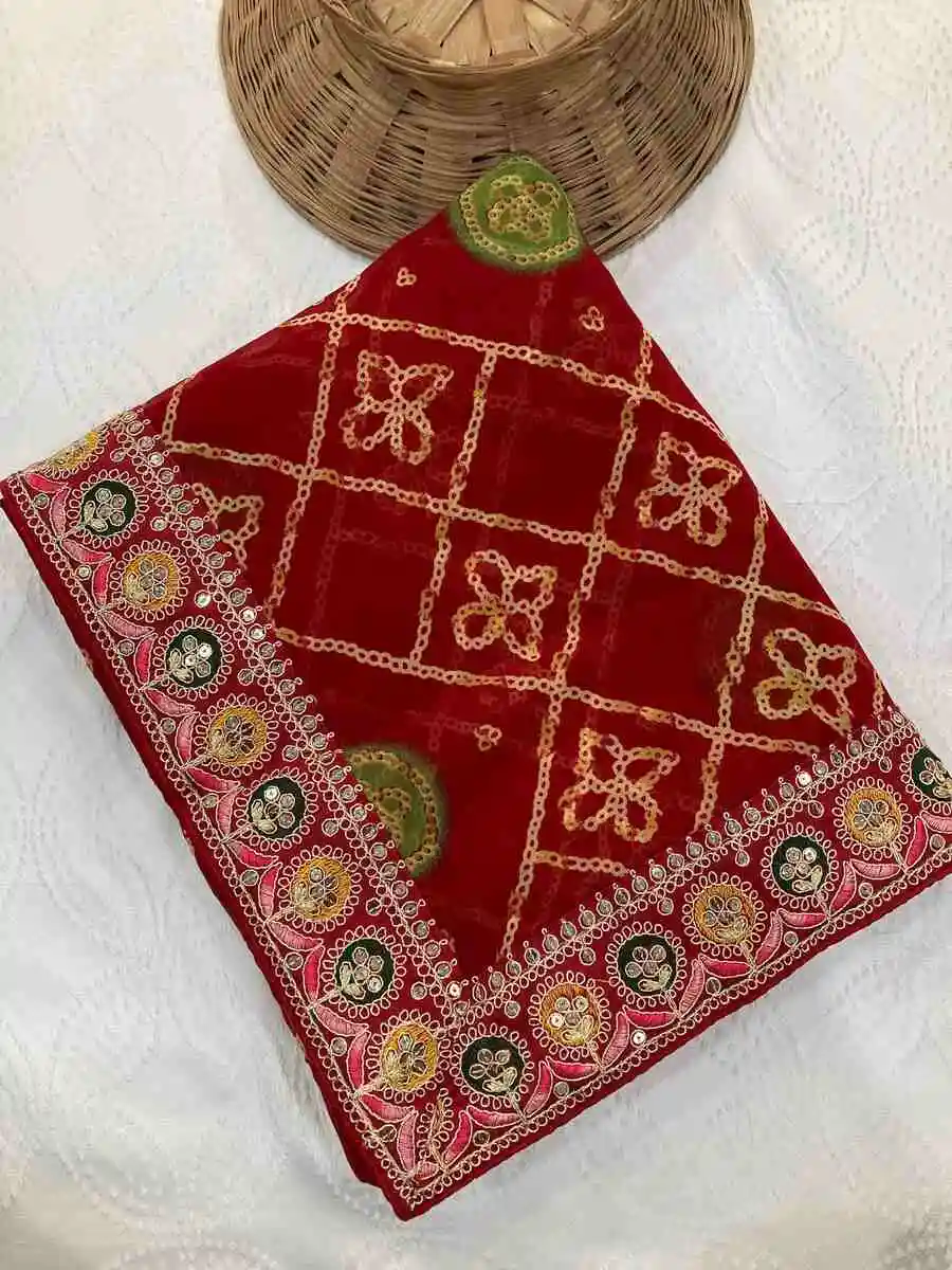 RICH LOOK GEORGETTE BANDHEJ PRINT WITH CUTWORK LACE BORDER WORK SAREE WITH UNSTITCHED BLOUSE RED
