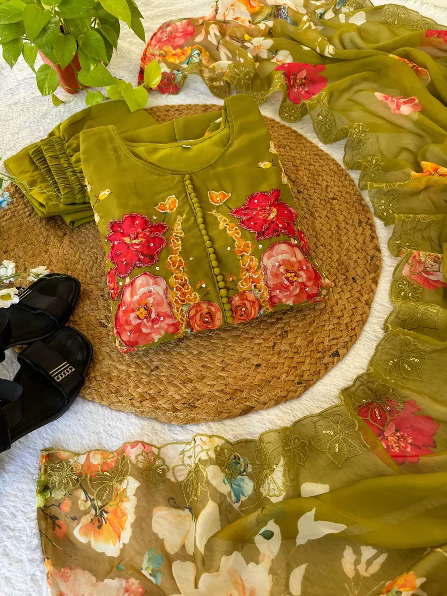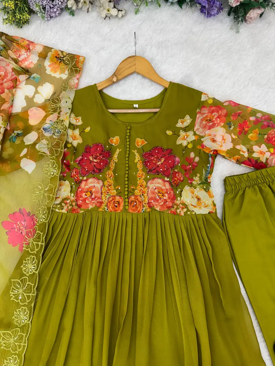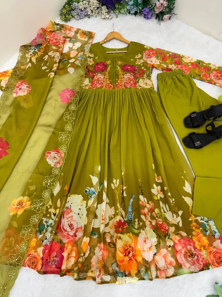 RICH LOOK GEORGETTE DIGITAL PRINT AND HANDWORK GOWN BOTTOM WITH DUPATTA PARROT GREEN