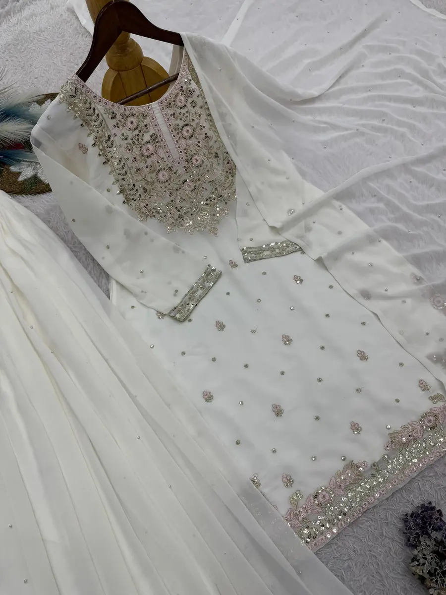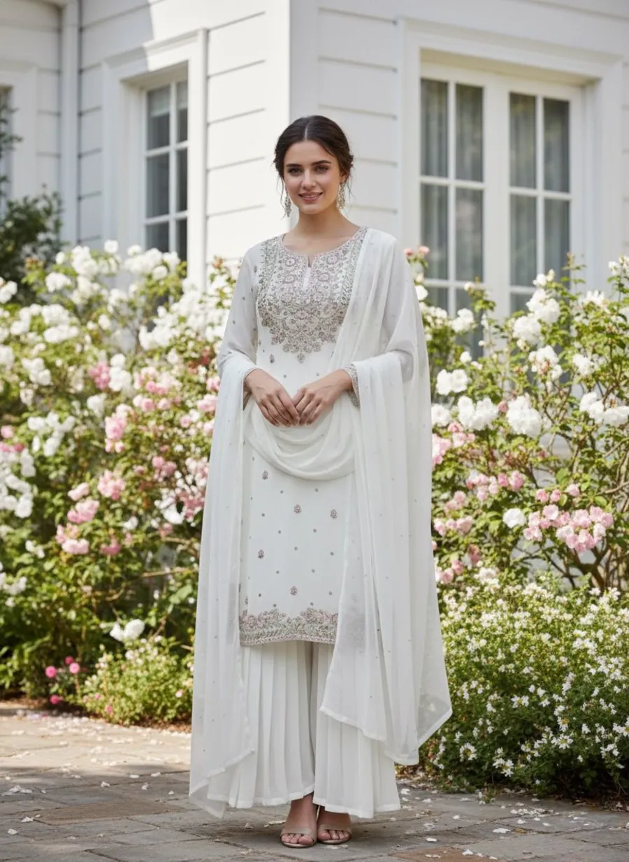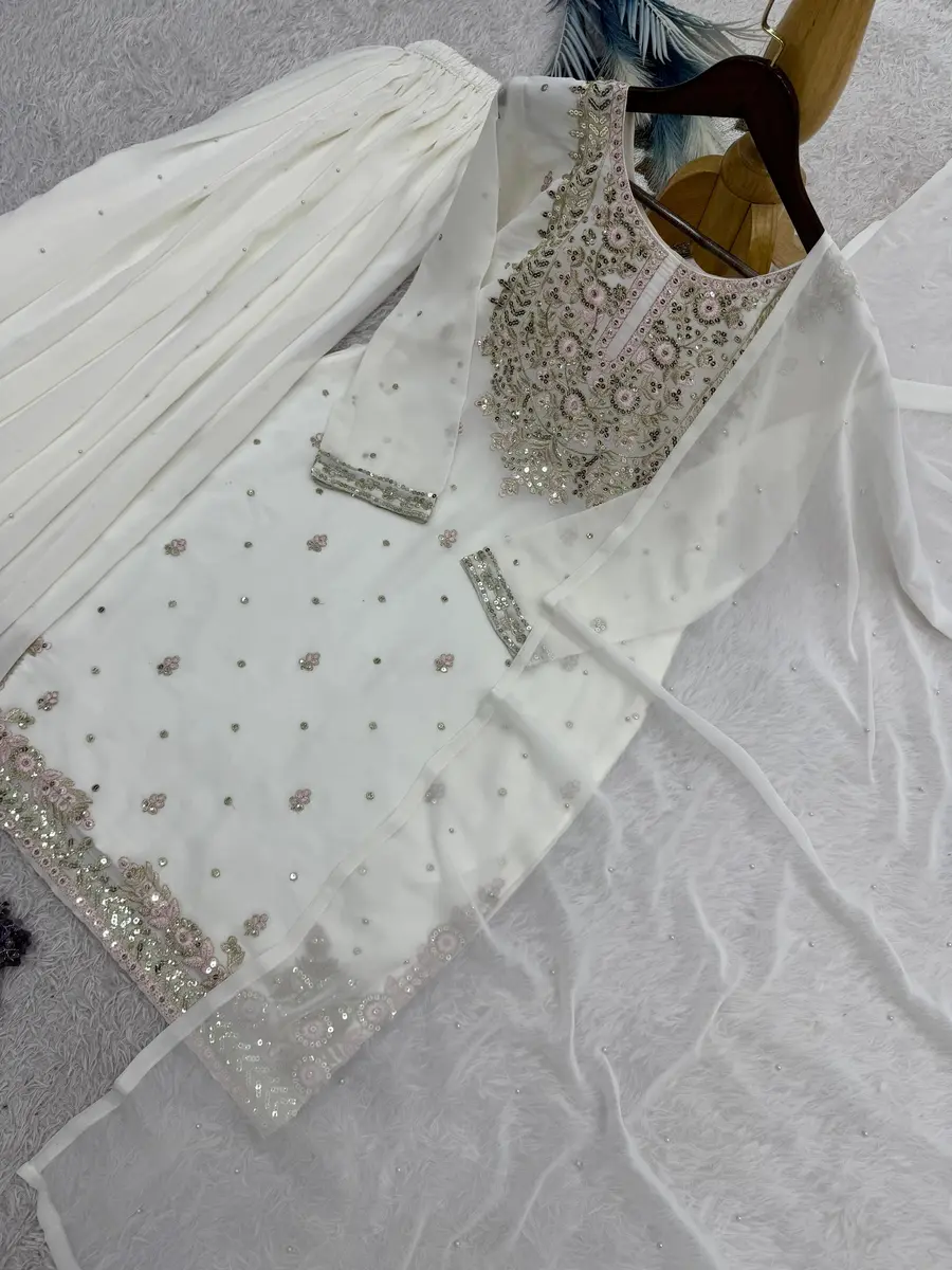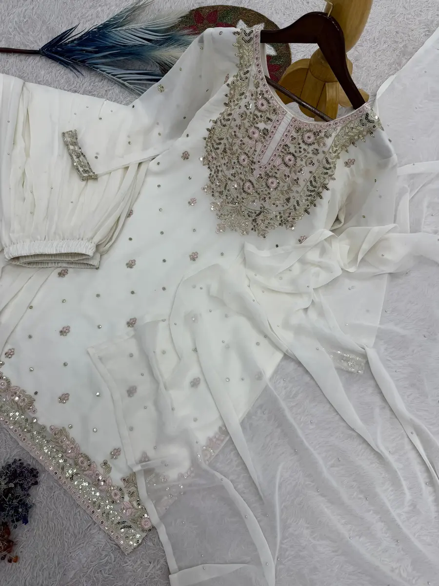 RICH LOOK GEORGETTE EMBROIDERY AND SEQUENCE WORK TOP PALAZZO WITH DUPATTA WHITE