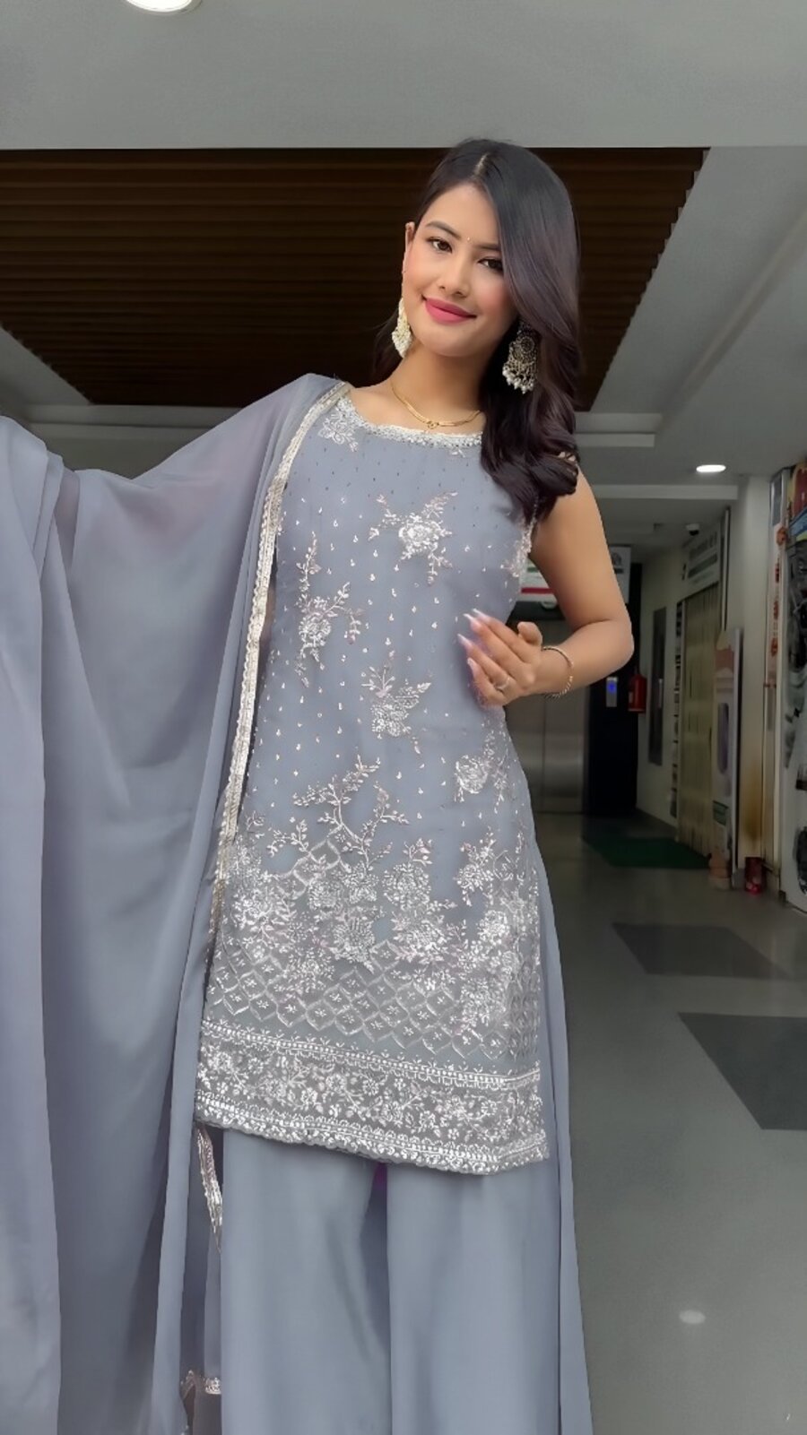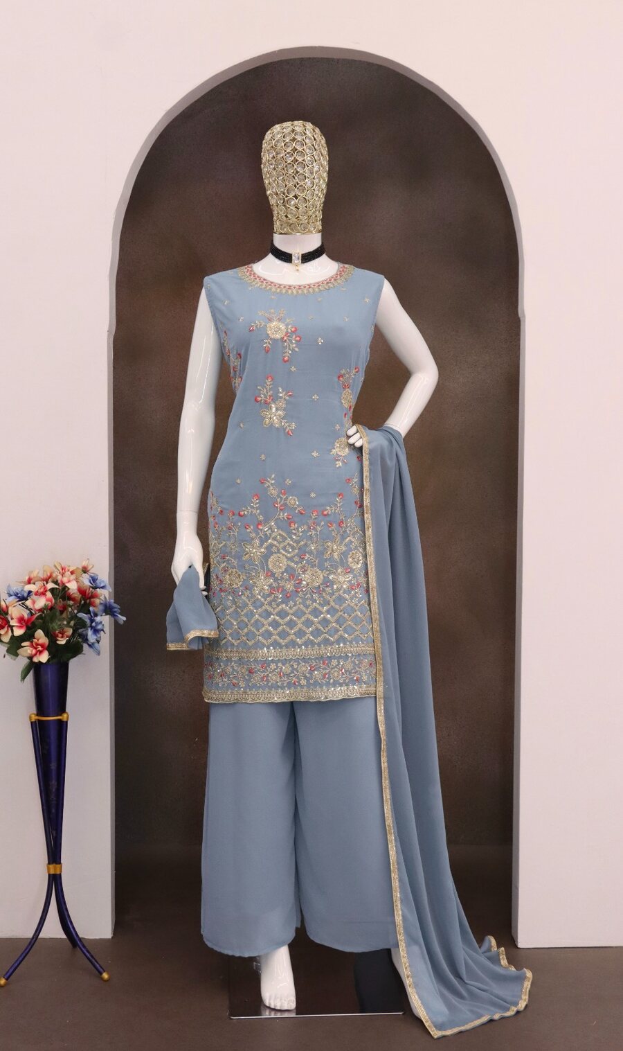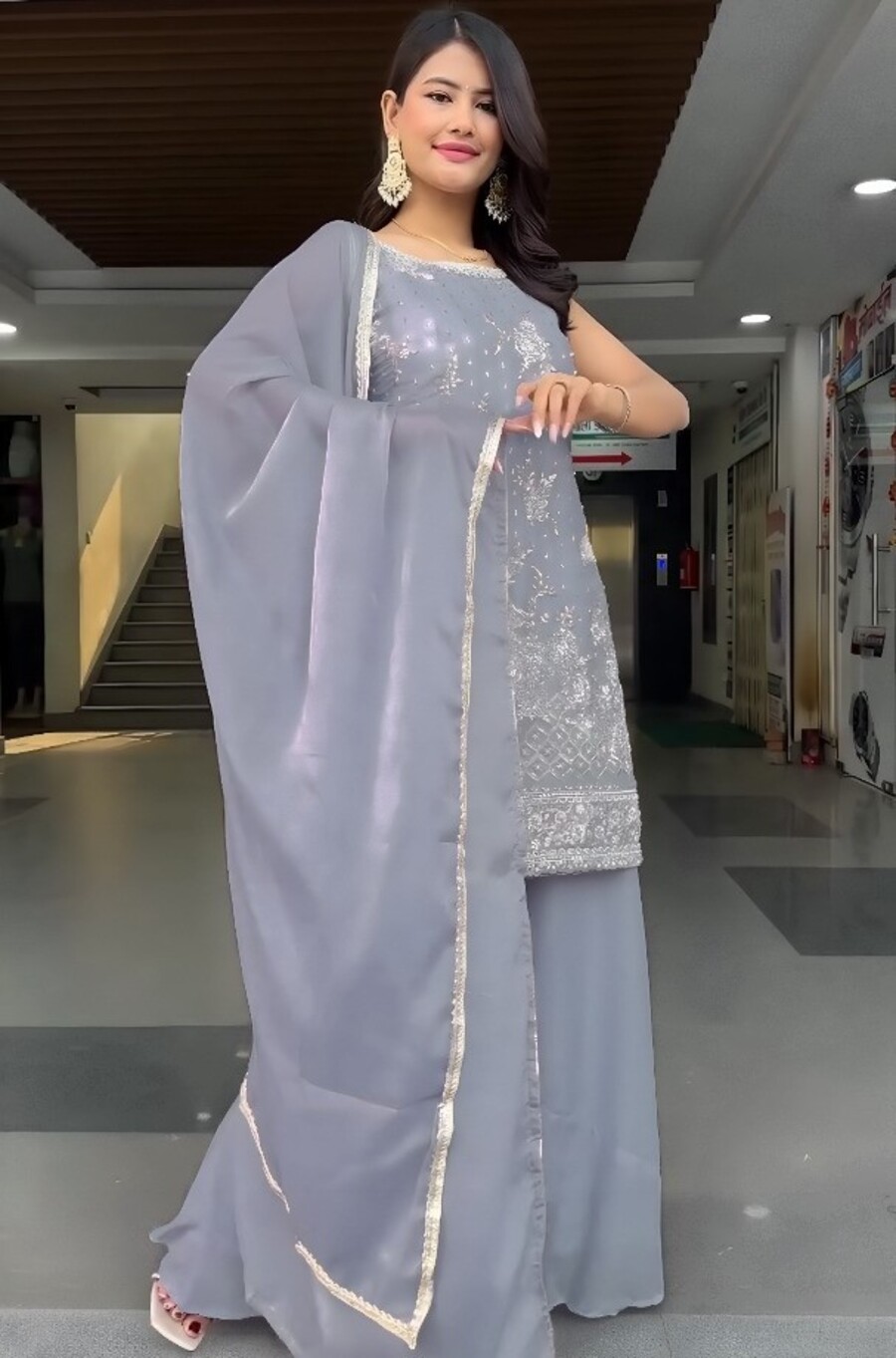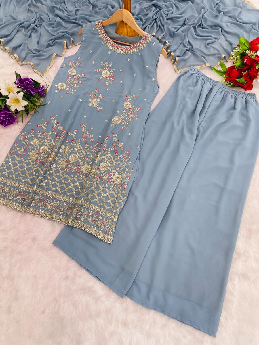 RICH LOOK GEORGETTE EMBROIDERY SEQUENCE WORK TOP PALAZZO WITH DUPATTA GREY