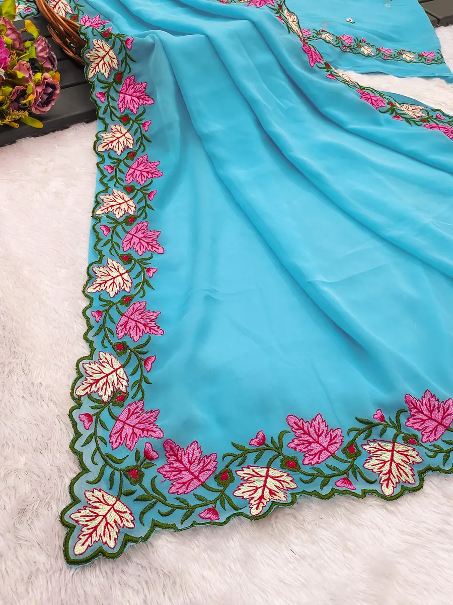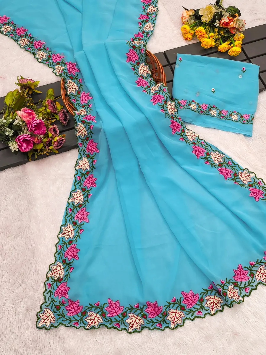 RICH LOOK GEORGETTE MULTI THREAD EMBROIDERY WORK SAREE WITH UNSTITCHED BLOUSE SKY
