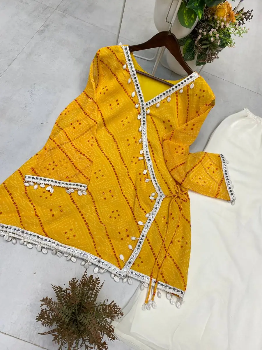 RICH LOOK GEORGETTE PRINTED WITH KODI LACE WORK KURTI PALAZZO SET YELLOW