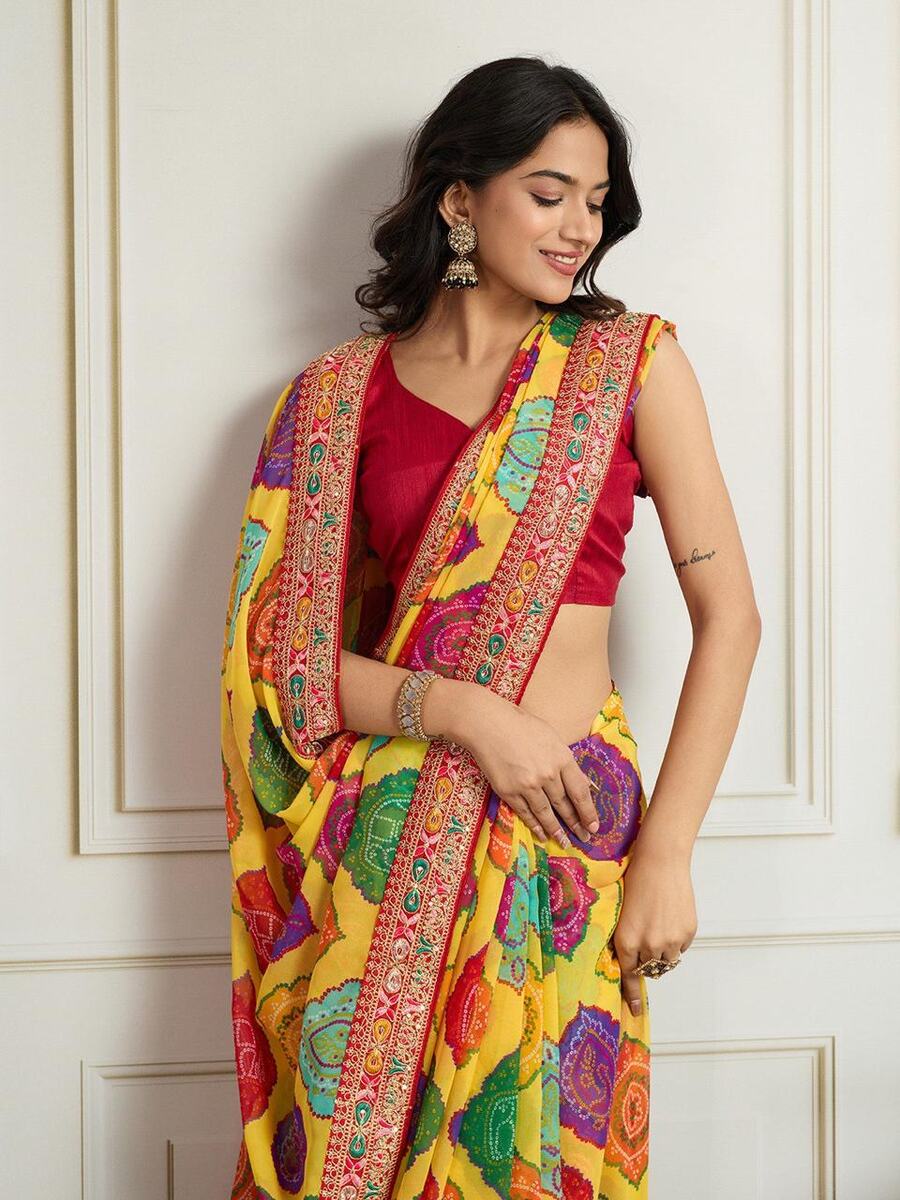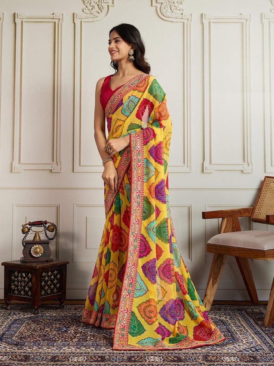 RICH LOOK GEORGETTE RAJWADI BANDHEJ PRINT WITH EMBROIDERY WORK SAREE WITH UNSTITCHED BLOUSE YELLOW