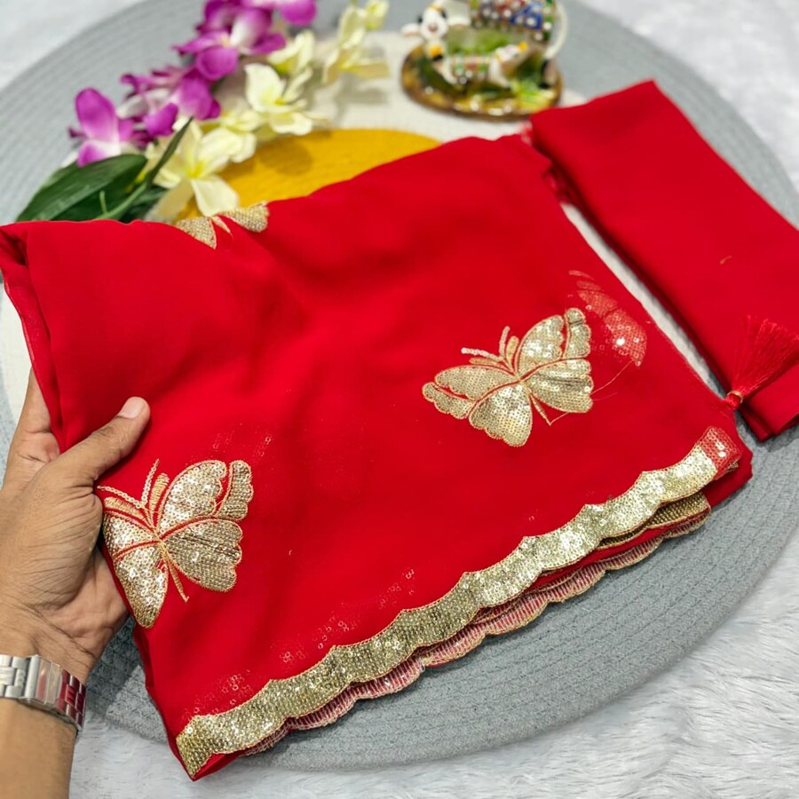 RICH LOOK GEORGETTE SEQUANCE WORK WITH BEAUTIFUL PEACOCK AND BUTTERFLY BUTTA WORK SAREE WITH UNSTITCHED BLOUSE RED