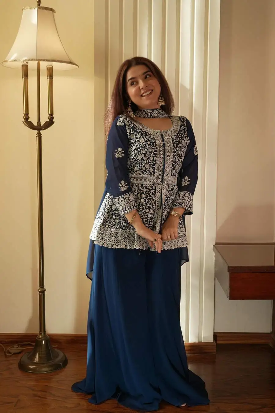 RICH LOOK GEORGETTE SEQUENCE EMBROIDERY WORK TOP PALAZZO WITH DUPATTA BLUE
