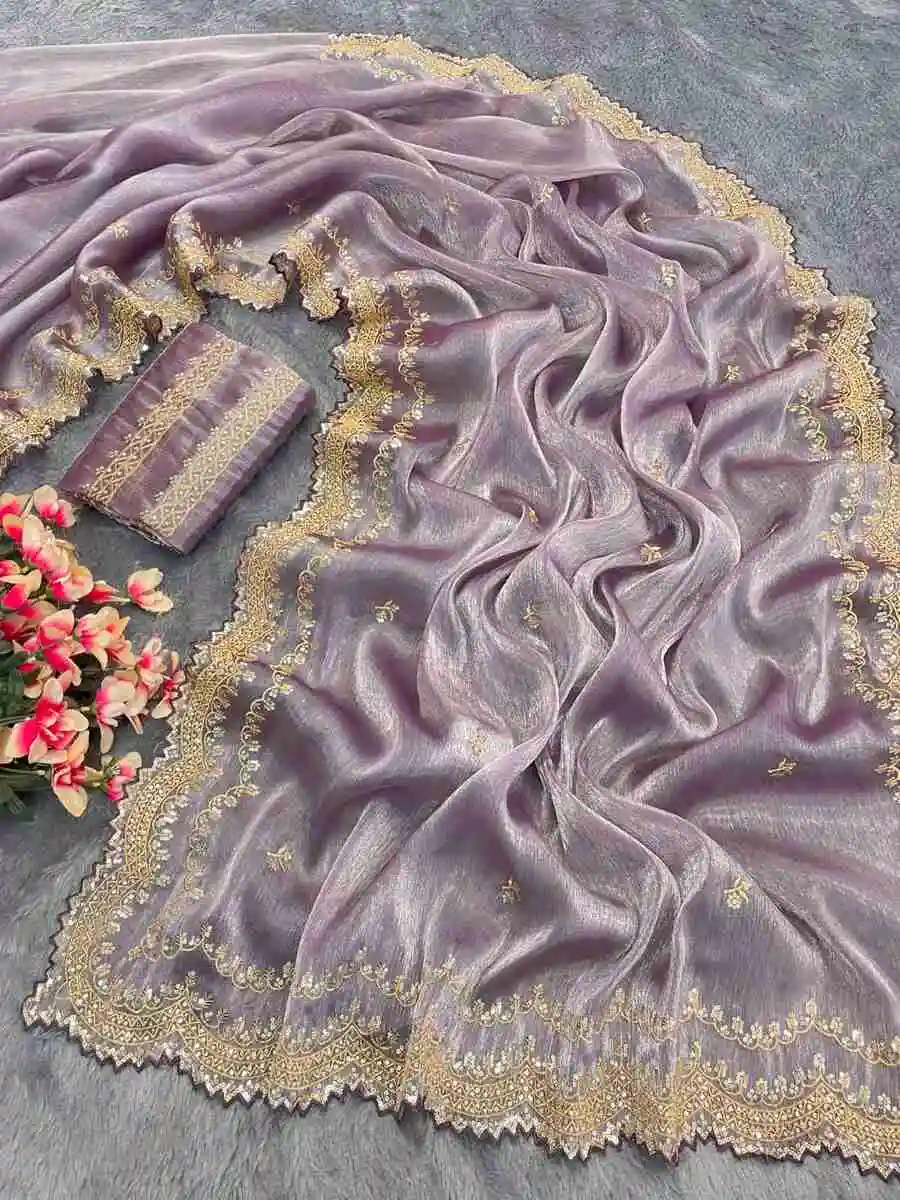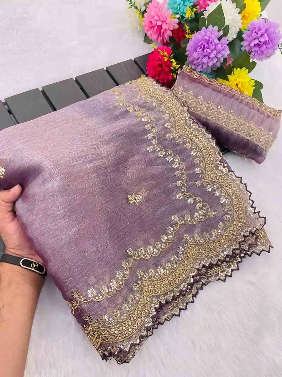 RICH LOOK GMY CHIFFON SILK SEQUENCE WORK SAREE WITH UNSTITCHED BLOUSE LAVENDER